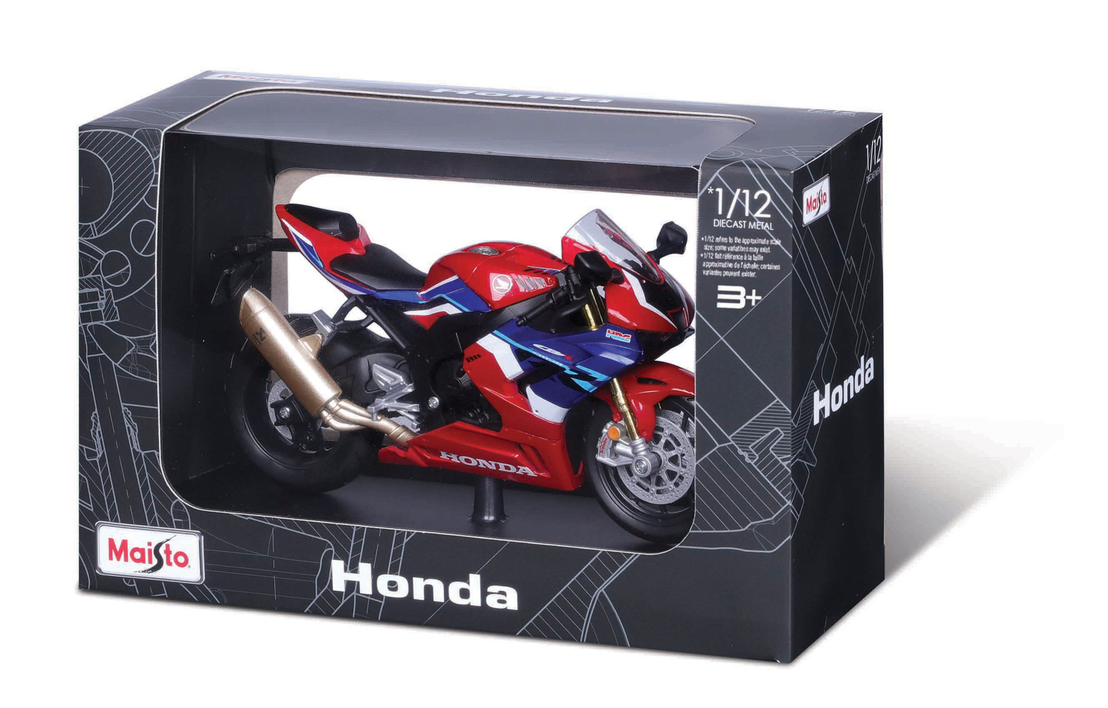 Honda CBR 1000RR-R Fireblade SP. Modely motocyklů v měřítku 1:12 mají u svých fanoušků velkou oblíbenost pro jejich dokonalé provedení a především velikost cca. 16 cm. Motocykly mají otáčivá řidítka a odpruženou zadní nápravu. Baleno v krabičce. Nevhodné pro děti do 3 let. Věk: 3+