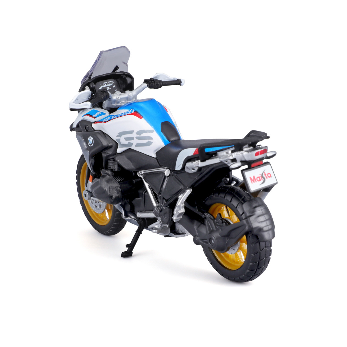 BMW R 1250 GS. Plastikové modely motocyklů v modelovém měřítku 1:18. Motocykly mají otáčivá řidítka a odpruženou zadní nápravu. Jsou usazeny na černém plastovém podstavci. Rozměry balení: 16x10,5x7cm. Věk: 3+