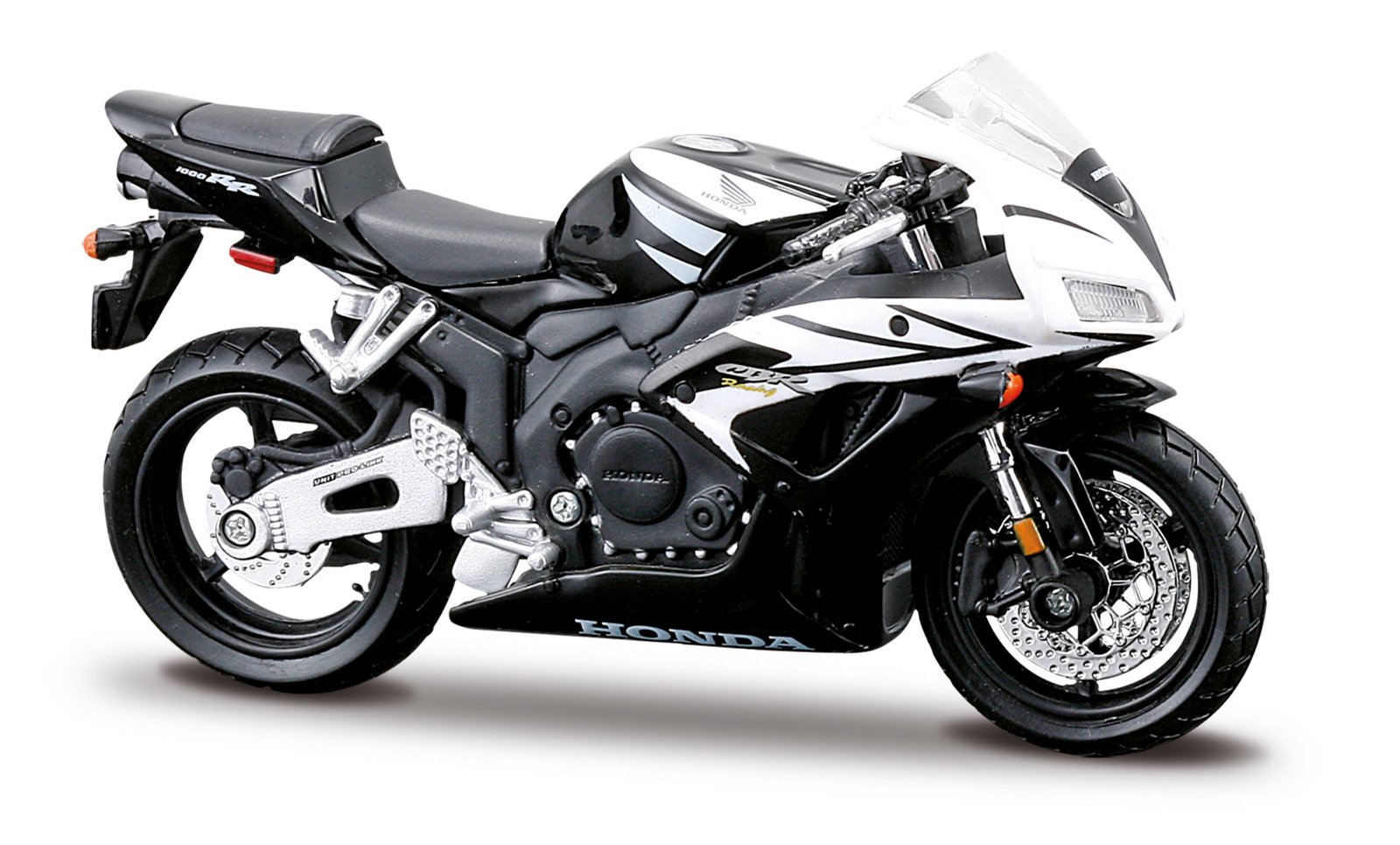 Honda CBR1000RR. Kovové modely motocyklů v modelovém měřítku 1:18. Motocykly mají otáčivá řidítka a odpruženou zadní nápravu. Jsou usazeny na černém plastovém podstavci. Rozměry balení: 16x10,5x7cm. Věk: 3+