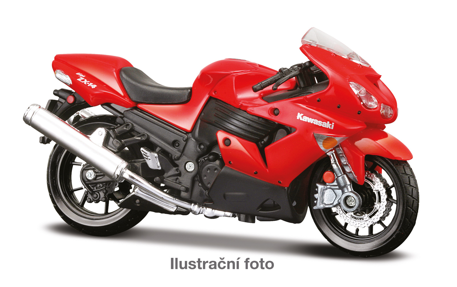 Kawasaki Ninja® ZX™-14R. Kovové modely motocyklů v modelovém měřítku 1:18. Motocykly mají otáčivá řidítka a odpruženou zadní nápravu. Jsou usazeny na černém plastovém podstavci. Rozměry balení: 16x10,5x7cm. Věk: 3+