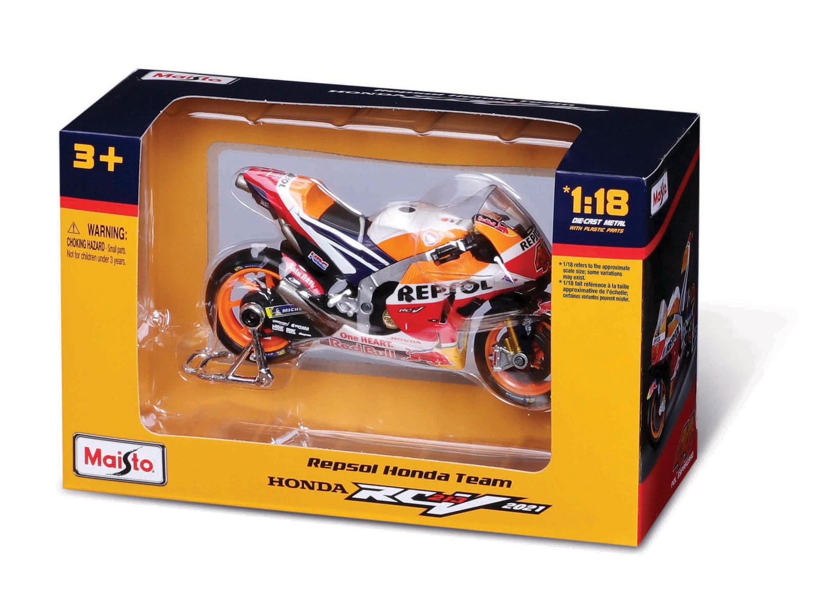 Motocykl GP Racing 1:18 Repsol Honda Team 2021, #44 POL ESPARGARO. Model oficiálního licencovaného závodního týmu má velmi dokonalé, detailní provedení jednotlivých částí a kvalitní barevné provedení. Kovový model s plastovými detaily. Model má volně se otáčející kola a je včetně podpěrného stojanu. Baleno v krabičce. Nevhodné pro děti do 3 let. Rozměry balení: 10,5 x 17,1 x 7 cm. Věk: 3 +