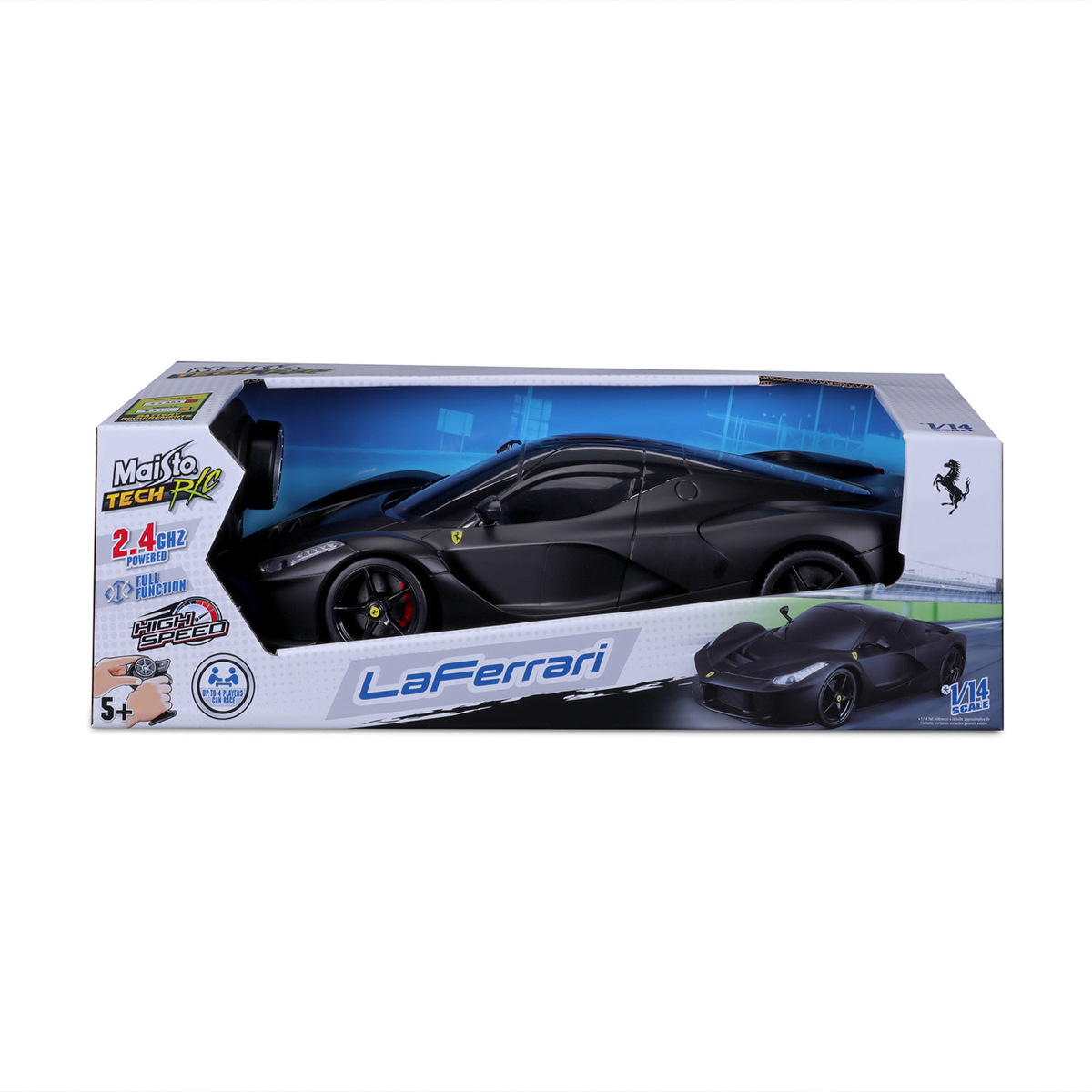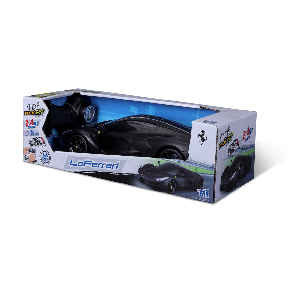 LaFerrari 1:14 RC. Plastový model sportovního vozu na dálkové ovládání. Plně funkční ovládání, světlomety a zadní světla. Autíčko vyžaduje 6 x AA baterie a ovladač 2 x AAA baterie. Baterie nejsou součástí balení. Možnost ovládaní díky frekvenci 2,4 GHz až pro 4 RC modely. Pistolový ovladač. Dosah ovládání až 35 m. Autíčko má diferenciální převodovku. Doba nabíjení 45 minut. Baleno v krabičce. Rozměry balení: 15,88 x 45,69 x 20,39 cm. Věk: 5+