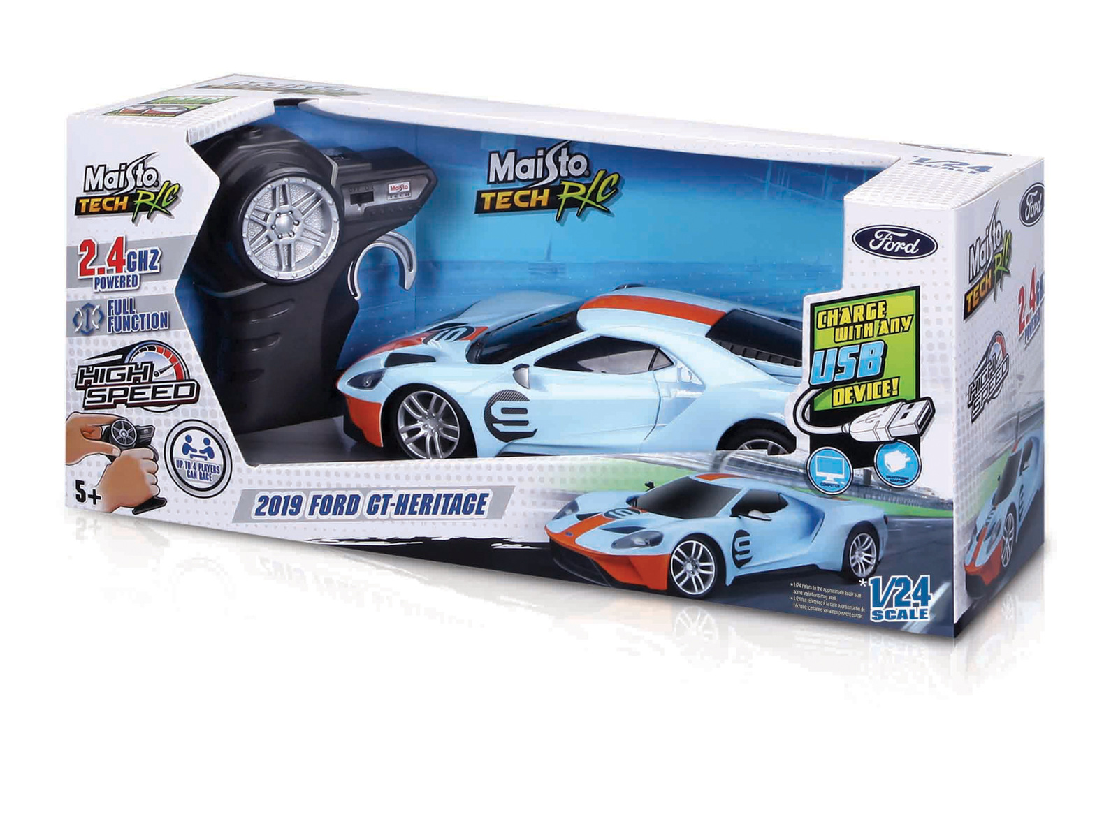 2019 Ford GT Heritage 1:24 RC Premium. Model sportovního vozu značky Maisto na dálkové ovládání. V autíčku je zabudovaná lithiová baterie, kterou lze dobíjet přes USB kabel (je součástí). Ovladač funguje na 2xAAA baterie (jsou součástí). 2,4 GHz – až 4 osoby. Pistolový ovladač. Dosah ovládání až 35 m. Doba nabíjení 45 minut. Rozměry balení: 13,3 x 31,75 x 11,1cm. Věk: 5+