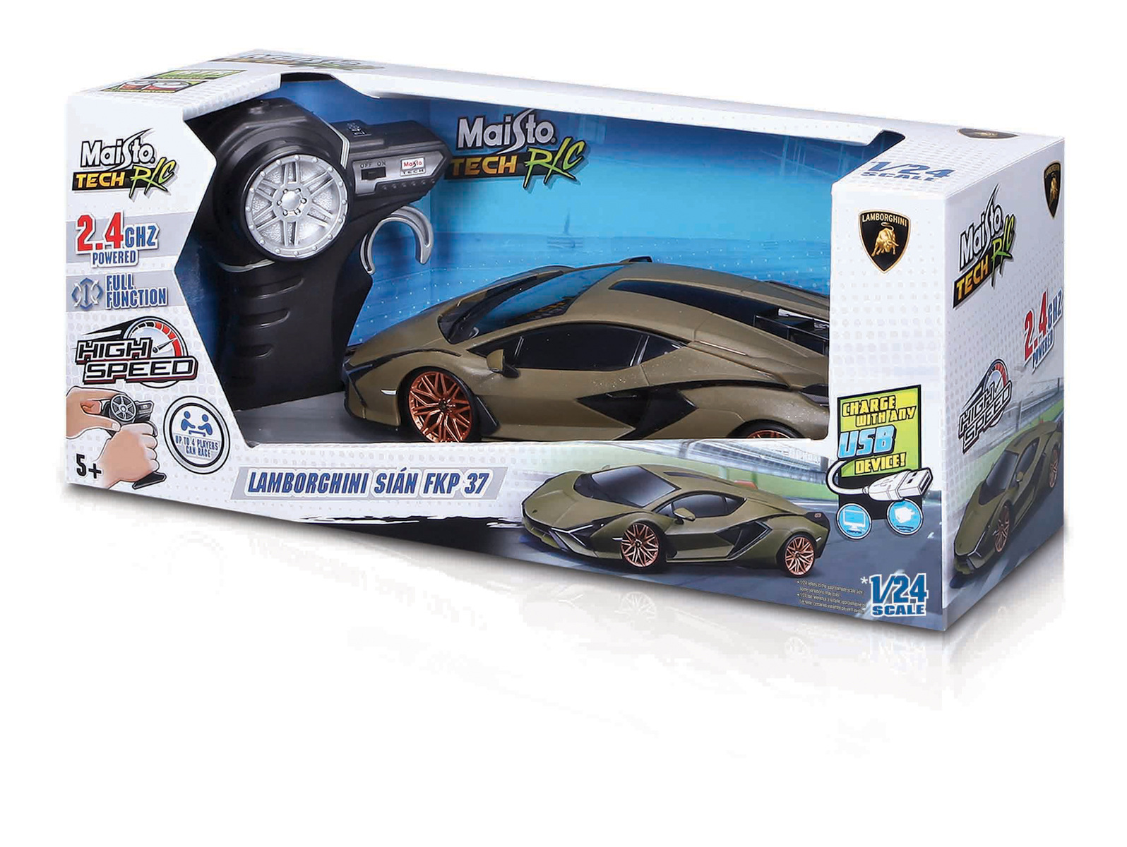 Lamborghini Sián FKP 37 1:24 RC Premium. Model sportovního vozu značky Maisto na dálkové ovládání. V autíčku je zabudovaná lithiová baterie, kterou lze dobíjet přes USB kabel (je součástí). Ovladač funguje na 2xAAA baterie (jsou součástí). 2,4 GHz – až 4 osoby. Pistolový ovladač. Dosah ovládání až 35 m. Doba nabíjení 45 minut. Rozměry balení: 13,3 x 31,75 x 11,1cm. Věk: 5+