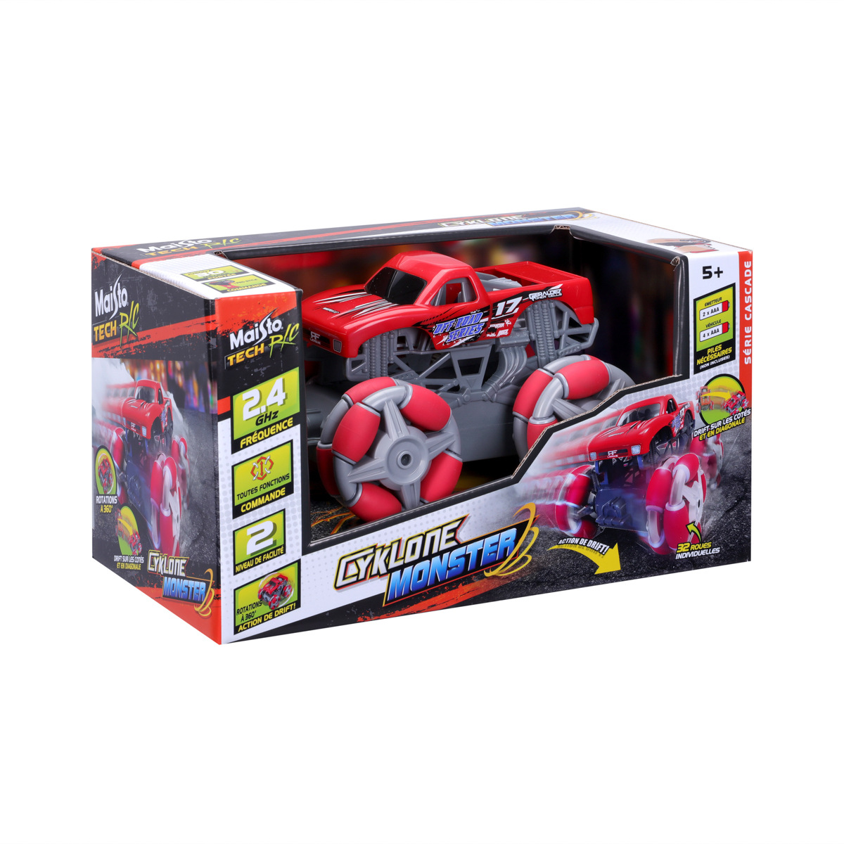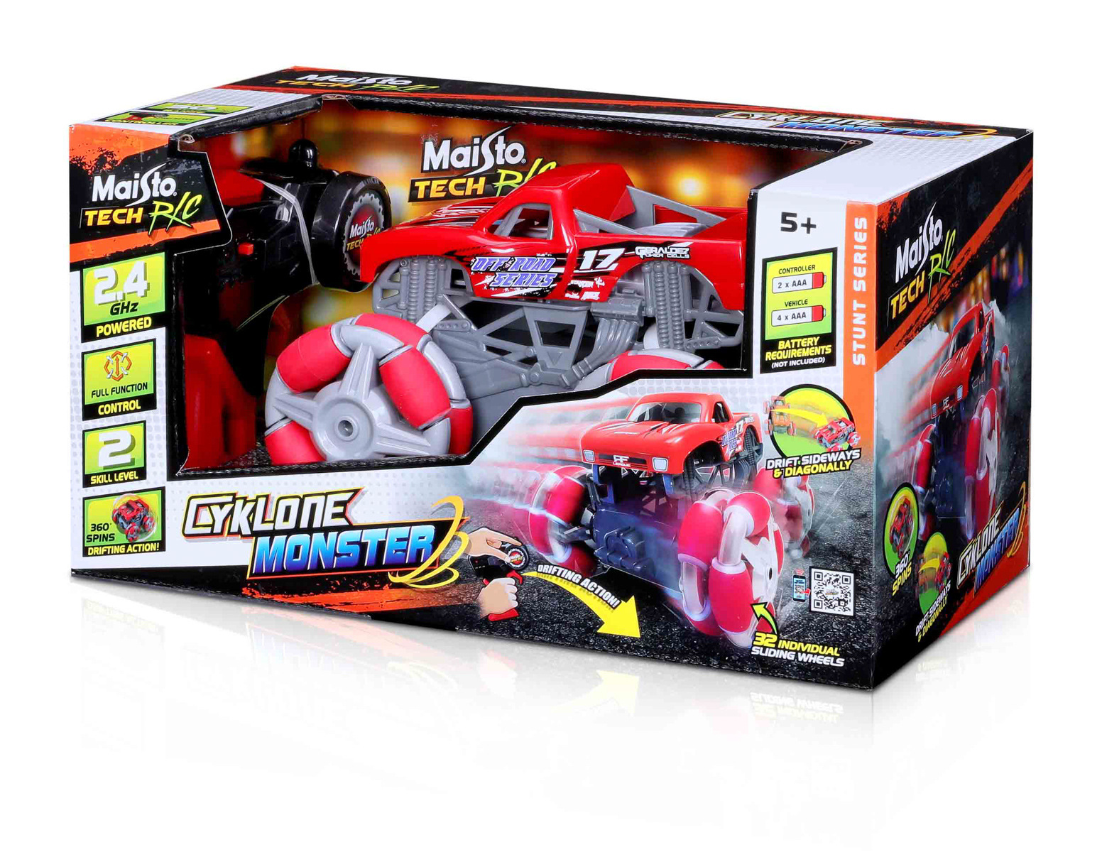 Cyklone Monster. Model sportovního vozu na dálkové ovládání od značky Maisto. Auto má unikátní kola, která se skládají z celkem 32 otočných válečků. Auto jezdí na 4xAAA a ovladač je na 2xAAA baterie, které nejsou součástí balení. Dosah ovladače až 35m. Balení: 28x15,2x15,2cm. Věk: 5+