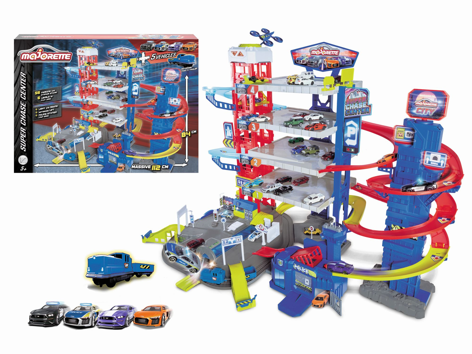 5 podlaží, motorizovaný výtah, 2 různá světla a zvuky, 4 kovová autíčka, vláček na baterie, 57 parkovacích míst, dvojitá dráha, policejní stanice s padacími dveřmi, rozměry 112 x 70 x 84 cm.