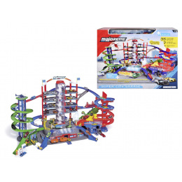 Velká herní garáž o šířce téměř 1,30 m je největší nový výrobek ve světě Majorette! Garáž se skládá ze sedmi herních ploch a má až 35 parkovacích a skladovacích prostor. Srdcem stanice je motorizovaný spirálový výtah, který současně nese až devět kovových autíček. Jakmile jsou nahoře, automatické přepínače rozdělují vozy do čtyř různých jízdních pruhů. Šest různých světelných a zvukových efektů, stejně jako nespočet herních stanic, jako je vlaková stanice, čerpací stanice s benzínovým čerpadlem, autoservisem a myčkou aut, požární stanice, policejní stanice s tajným úkrytem nebo heliport, nabízí neomezenou zábavu. Součástí je 6 kovových autíček, vlak poháněný na baterie, automatické výhybky, tunel s funkcí havárie a 2 motorizované výtahy. Vrtulník není součástí. Rozměry po sestavení: 128 x 78 x 73 cm.