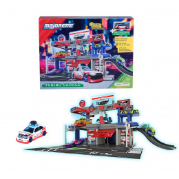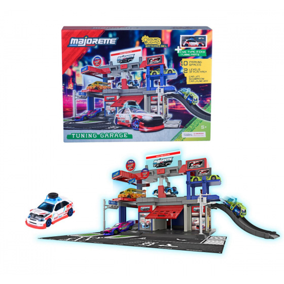 Tuningová garáž Majorette má 2 patra, čerpací stanici, manuálně ovládaný výtah a světelné i zvukové efekty, zvedací plošinu, tuningovou část a 10 parkovacích míst. Jedno autíčko 7,5 cm součástí. Rozměry po sestavení: 35,5 x 45,5 x 23,5 cm.