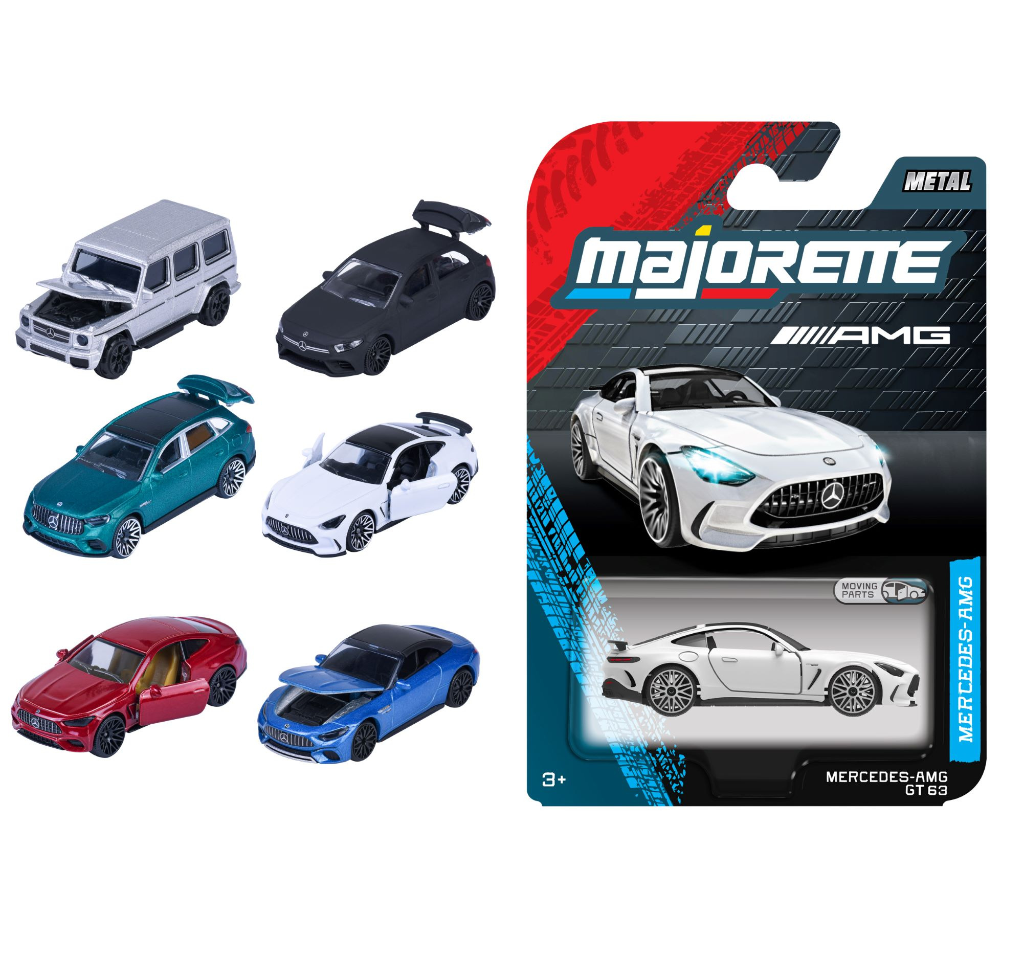 Kovové autíčko na volnoběh Mercedes-AMG Premium v měřítku 1:64. Otevírací části, 6 druhů. Délka 7,5 cm.