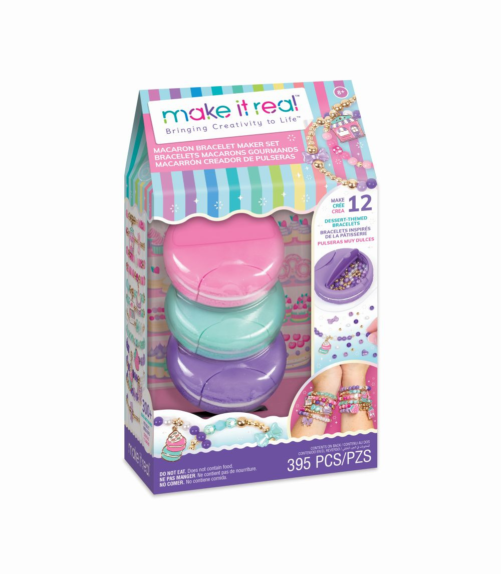 Díky 3 výrobcům náramků ve tvaru makaronů jsme vyrobili náramky ještě sladší! Každý macaron obsahuje vše potřebné k výrobě 4 náramků pro celkem 12 sladkých doplňků. Vytáhněte a obtočte šňůru po obvodu macaronu, abyste šňůru změřili a odstřihli. Otevřete pouzdro a najděte přívěsky a korálky s motivem dezertů připravené k ozdobení každého náramku. Noste rozkošných 12 náramků nebo darujte přátelům, abyste se podělili o nějakou sladkost! Ukládejte náramky a materiály zpět do macaronů mezi řemeslnými seancemi pro zábavu bez nepořádku. To je skvělý tip na dárek pro mladé kreativce, ať už k svátku, narozeninám nebo jen tak! Darujte kreativitu a sebevyjádření. Ideální pro věk 8+.