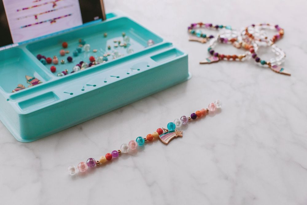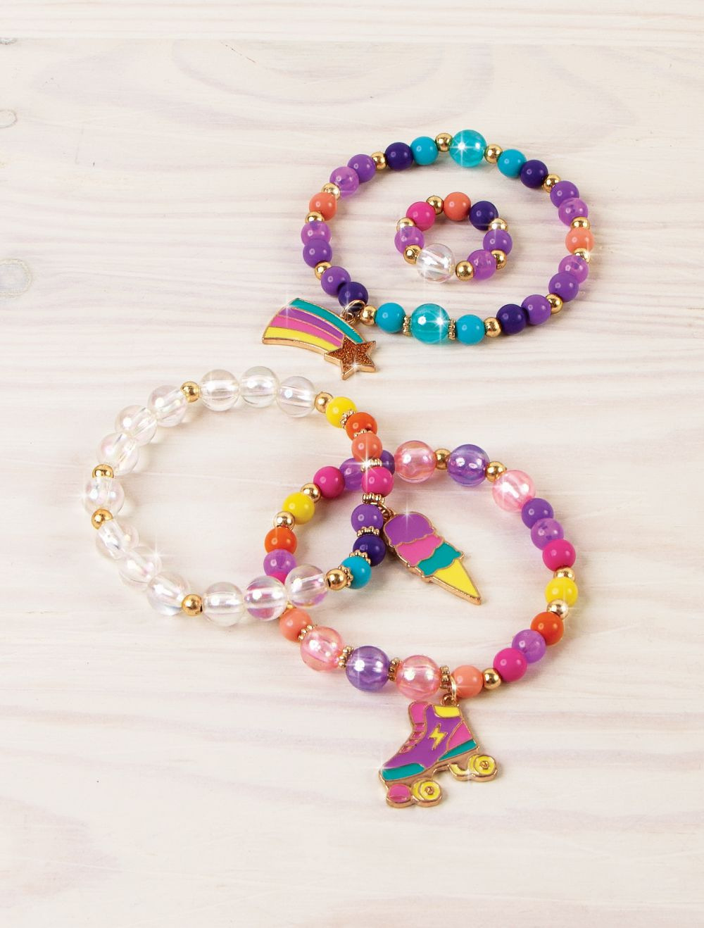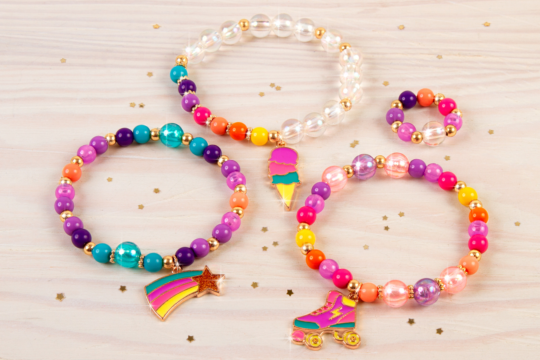 Náramky s přívěsky. Obsahuje: 70 perel, 42 zlatých perel, 3 přívěsky, průsvitnou šňůru dlouhou 1m, instrukce.