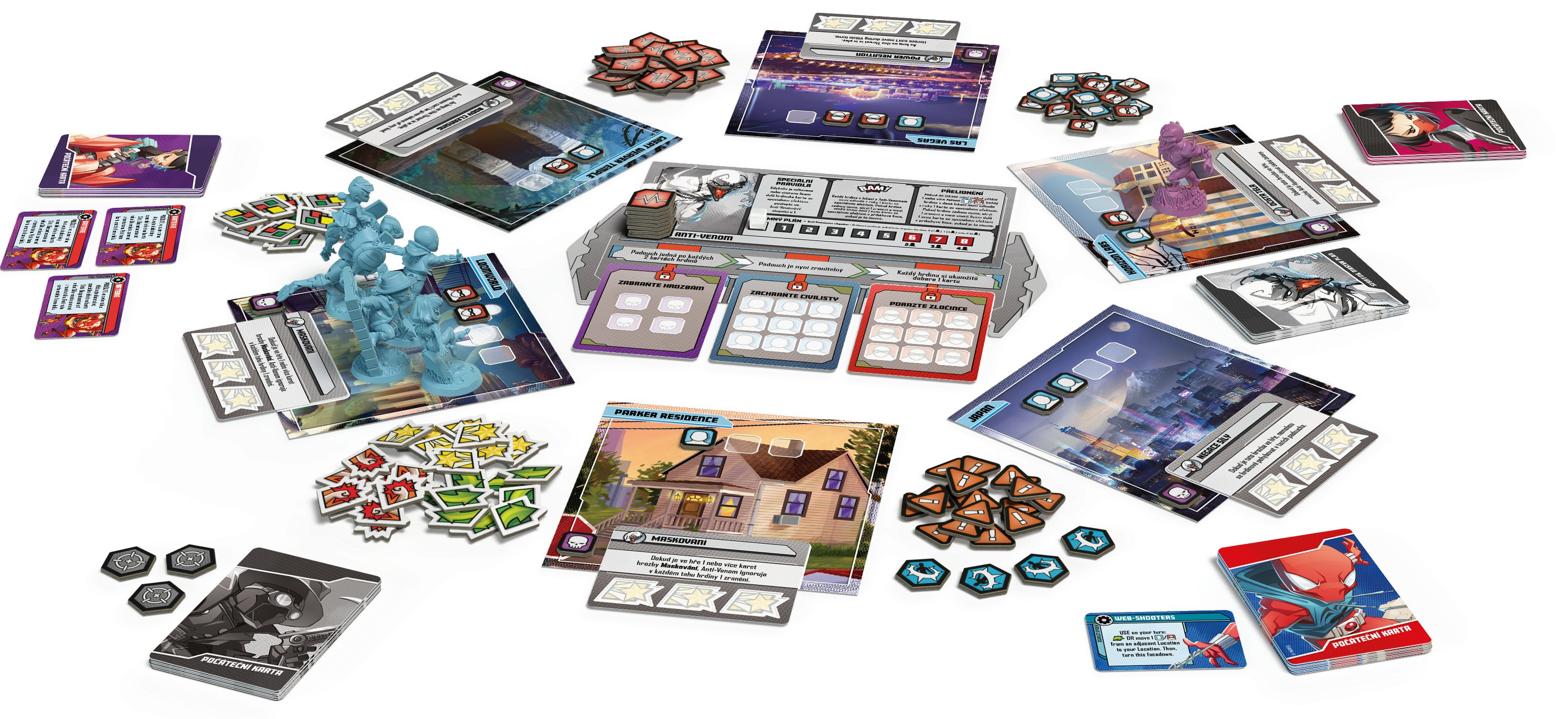 Obsah balení: 6 figurek hrdinů 2 figurky anti-hrdinů 2 figurky padouchů 215 karet 4 desky padouchů 8 lokací 1 přehled misí 156 žetonů 1 ukazatel padoucha 1 pravidla