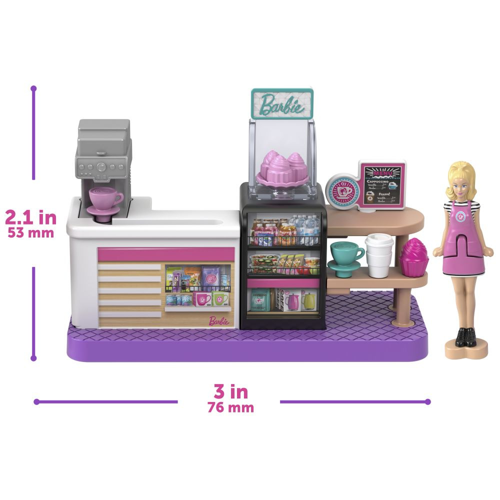 Vstupte do světa panenky Barbie® s Mini BarbieLandem - místem, kde si můžete i s malou hračkou představovat velké věci! Tento mini herní set Pekařství je plný roztomilosti a velkých překvapení, je připraven ke hře nebo vystavení. Herní set obsahuje interaktivní hrací plochy, jako jsou stanice s kávovarem, stojan na pečivo, posezení a miniaturní téměř 4 cm velkou panenku Barbie! Všechny panenky se ohýbají v pase a stojí na podstavci ve tvaru srdce.