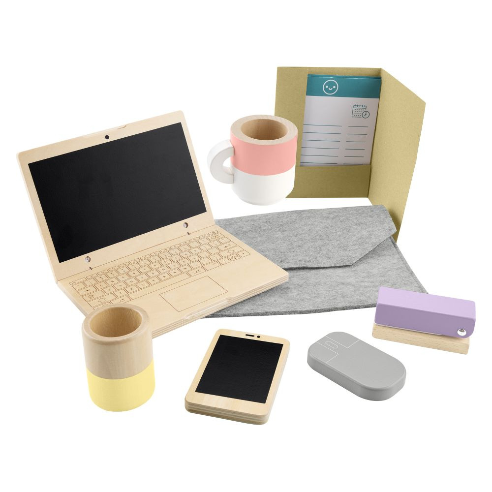 S dřevěným herním setem pro práci z domu od Fisher-Price® si děti v předškolním věku můžou zahrát na povolání maminky nebo tatínka. Set obsahuje 9 dílů: přenosný počítač a telefon s křídovými obrazovkami, počítačovou myš, hrnek na kávu, sešívačku, kelímek s perem, složku na dokumenty a sadu dokumentů. Dílky jsou vyrobené ze dřeva ze zdrojů s certifikací Forest Stewardship Council (FSC C130462).