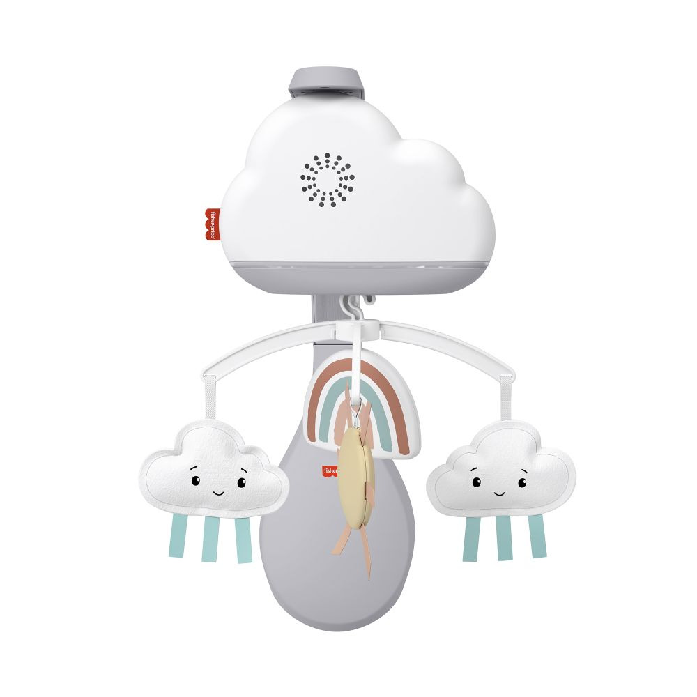 Fisher-Price® Kolotoč nad postýlku déšť s duhou má oslnivé závěsné hračky v podobě mráčků a sluníček a obsahuje 20minutovou melodii, která pomůže vašemu novorozenci uvolnit se a usnout. Praktický snímač pláče automaticky spustí uklidňující hudbu a kolotoč, když děťátko vydá zvuk! A když děti povyrostou, odejměte mráček z kolotoče a vytvořte z něj uspávací hračku na noční stolek. Není určeno pro použití na ohrádky se stříškou nebo postýlky se stříškou.