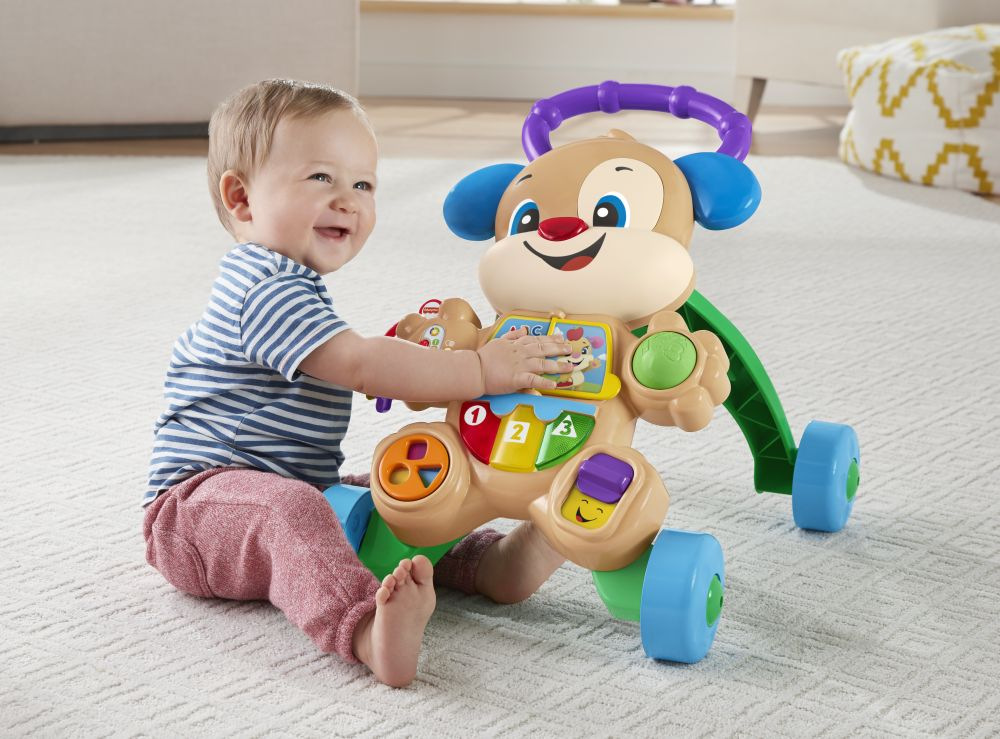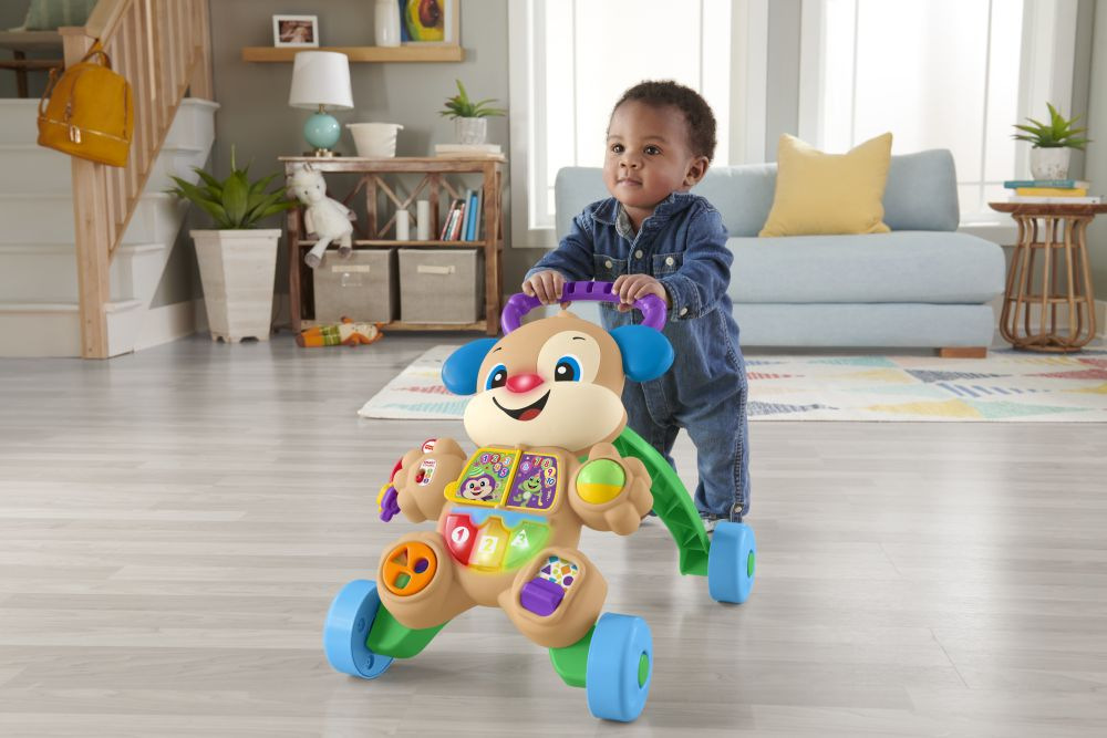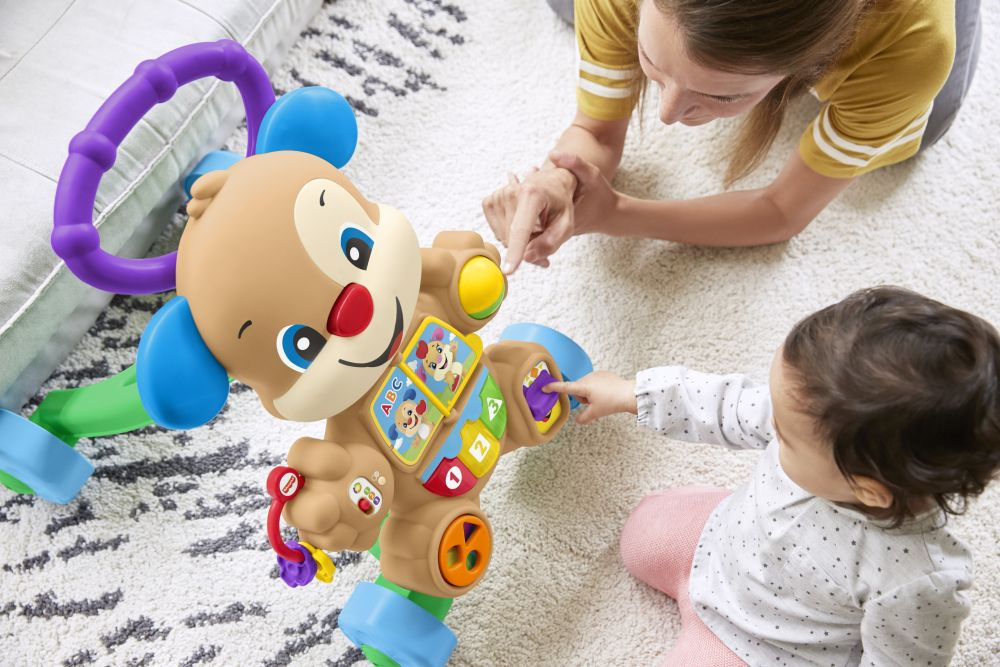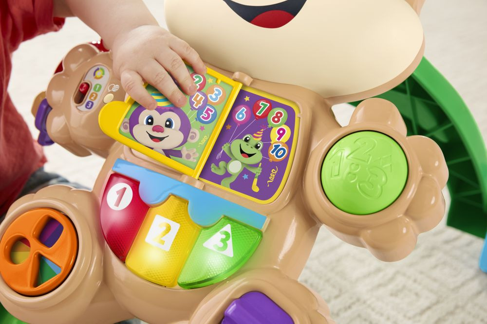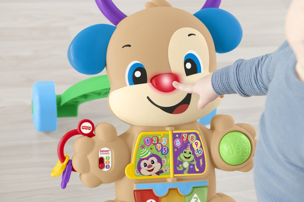 Pojďme se projít, zlato! Smart Stages ™ Učte se s chodítkem štěnětem je dokonalým kamarádem pro vaše rostoucí dítě, který nabízí vzrušující praktické aktivity pro malé sedící děti a spoustu povzbuzujících frází a podpory pro tyto první malé kroky. Jak děti rostou a chodí, štěně jim představí abecedu, tvary, barvy, počítání a dokonce i anglická slova! Kde rozvoj vchází do hry ™ Nauka: Hravé písničky a fráze seznámí Vaše dítě mimo jiné s abecedou, barvami, čísly a anglickými slovy! Hrubá motorika: Velký trénink pro malé svaly, když malé děti sedí, natahují se a interagují s aktivitami a poté se zvedají, aby se postavily, a kráčí za chodítkem. Zvědavost a údiv: Když děti objevují, jak aktivovat hudbu a fráze stisknutím tlačítek nebo posunutím chodítka, vidí, že jejich činy mohou vyvolat zábavné věci – hej, to je příčina a účinek!