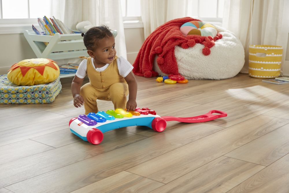 Ikonický klasický xylofon ve zvětšené velikosti od Fisher-Price® má dva režimy hry. Stisknutím 8 svítících tlačítek aktivují děti obsah, který učí abecedu, čísla, tvary a první slova. Protože se každé dítě vyvíjí jinak rychle, podporuje hračka technologii Smart Stages™, díky níž můžete zvolit takovou úroveň obsahu, která je pro vaše děťátko zrovna nejvhodnější. Vybrat můžete mezi třemi úrovněmi výukového obsahu. Druhý režim hry nabízí dětem zábavnou hru na tahání, kdy děti mohou táhnout xylofon za sebou za rukojeť. Rukojeť se dá sklopit pod hračku pro pohodlnou hru v sedě.