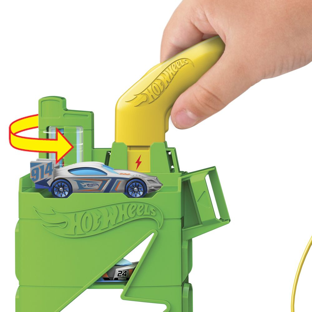 Připravte se na hru na nabité dráze se Super nabíjecí stanicí Hot Wheels City! Tento interaktivní herní set obsahuje polohovatelnou rukojeť pro nabíjení připomínající elektromobil, kterou děti zasunou na určená místa a aktivují tak skvělé detaily, například výměnu značek, výtahy pro auta a odpalovací zařízení. Zaparkujte na stanici 10 angličáků v měřítku 1:64 pro další hru i uskladnění. Jedno autíčko Hot Wheels je součástí balení, další vozidla se prodávají samostatně. Super nabíjecí stanice se připojuje k dalším setům a drahám Hot Wheels, takže si děti mohou sestavit vlastní jedinečnou městskou scenérii pro dobrodružství s volným koncem. Barvy a provedení dekorací se mohou lišit.