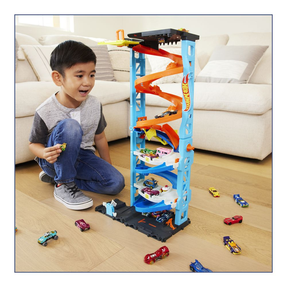 Vydejte se na epické závody v Hot Wheels™ City Závodní věži. Inovativní herní set se transformuje z vedle sebe umístěných závodních drah s brankami pro spravedlivý start na jedinou dráhu, která je více než 66 cm vysoká. Součástí je 1 vozidlo Hot Wheels® a spousta herních prvků pro posouvání na základně, které podporují samostatnou hru.