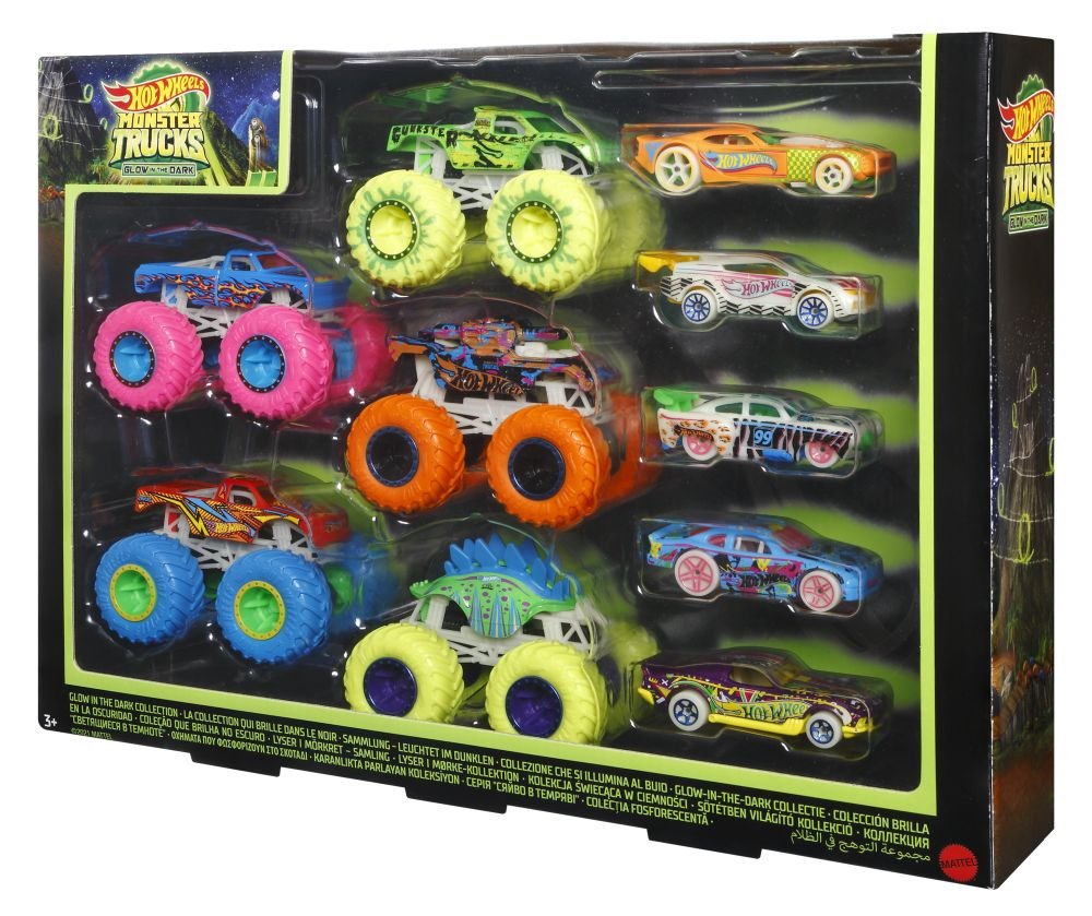 Celkem 10 aut pohromadě dělá z tohoto setu Hot Wheels® Monster Trucks Svítící ve tmě angličák & truck hotovou sbírku! Pět monster trucků z odolného kovu a pět angličáků v měřítku 1:64 zaručuje nekonečnou senzační hru s bouračkami - ať už necháš světla zapnutá, nebo je vypneš! Prvky zářící ve tmě dávají „rychlosti světla“ nový rozměr. Děti mohou sbírat další auta a hračky Monster Trucks pro ještě více kaskadérských kousků, závodění a bojování! Skvělý dárek pro děti od 4 až do 8 let, hlavně pro fanoušky monster trucků! Barvy a vzhled výrobků se mohou lišit.