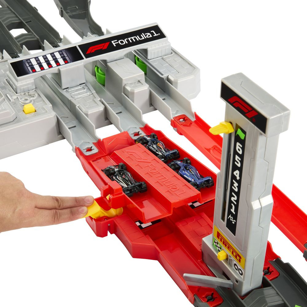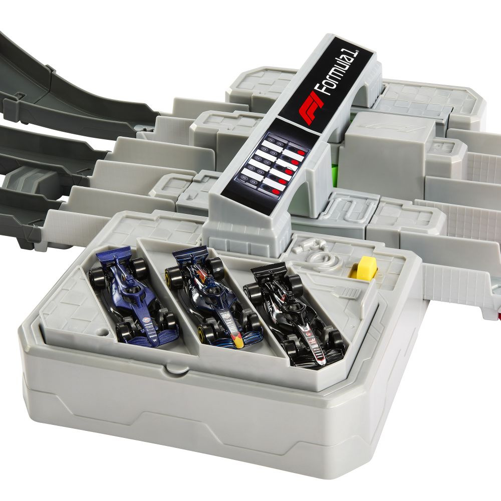 Zažijte atmosféru napínavých závodů Formule 1 Grand Prix přímo doma s touto jedinečnou závodní dráhou Hot Wheels. V závodním režimu počítadlo kol sleduje, jak modely sviští tříproudovým zrychlovačem a projíždějí zatáčky i převýšení inspirované reálnými městskými okruhy. Děti mohou využít interaktivní předjížděcí systém, který umožní vozům v zatáčce nečekaně změnit směr a dostat se do vedení – vítěz je ten, kdo jako první prolétne cílovou bránou. V nekonečném režimu se tři přiložené kovové modely F1 vozů neustále předhánějí. Dráha je kompatibilní se systémem Speed Snap, což umožňuje její snadné rozšíření o další části. (Další sety a dráhy Hot Wheels se prodávají samostatně.) Barvy a vzhled výrobku se mohou lišit.