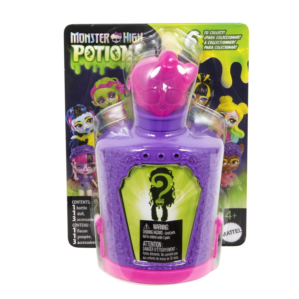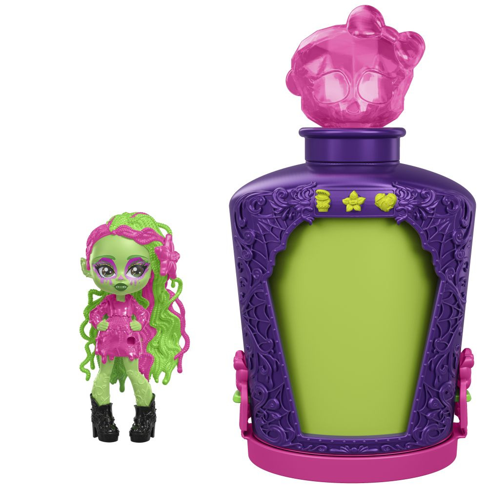 Darujte Monster High™ panenku v děsivé velikosti! Stačí namíchat lektvar a získáte strašidelné překvapení. Herní set Monster High™ Elixíry s malou monsterkou obsahuje kouzelné lahvičky s přibližně 7 cm velkou figurkou oblíbené příšerky Monster High™ a tři "kouzelné" přívěsky pro vlastní zábavu! Uvařte lektvar ve čtyřech krocích: do lahvičky nalijte vodu a vložte do ní přívěsky, protřepejte a sledujte, jak se tvoří lektvar, vylijte směs a pak odhalte panenku!