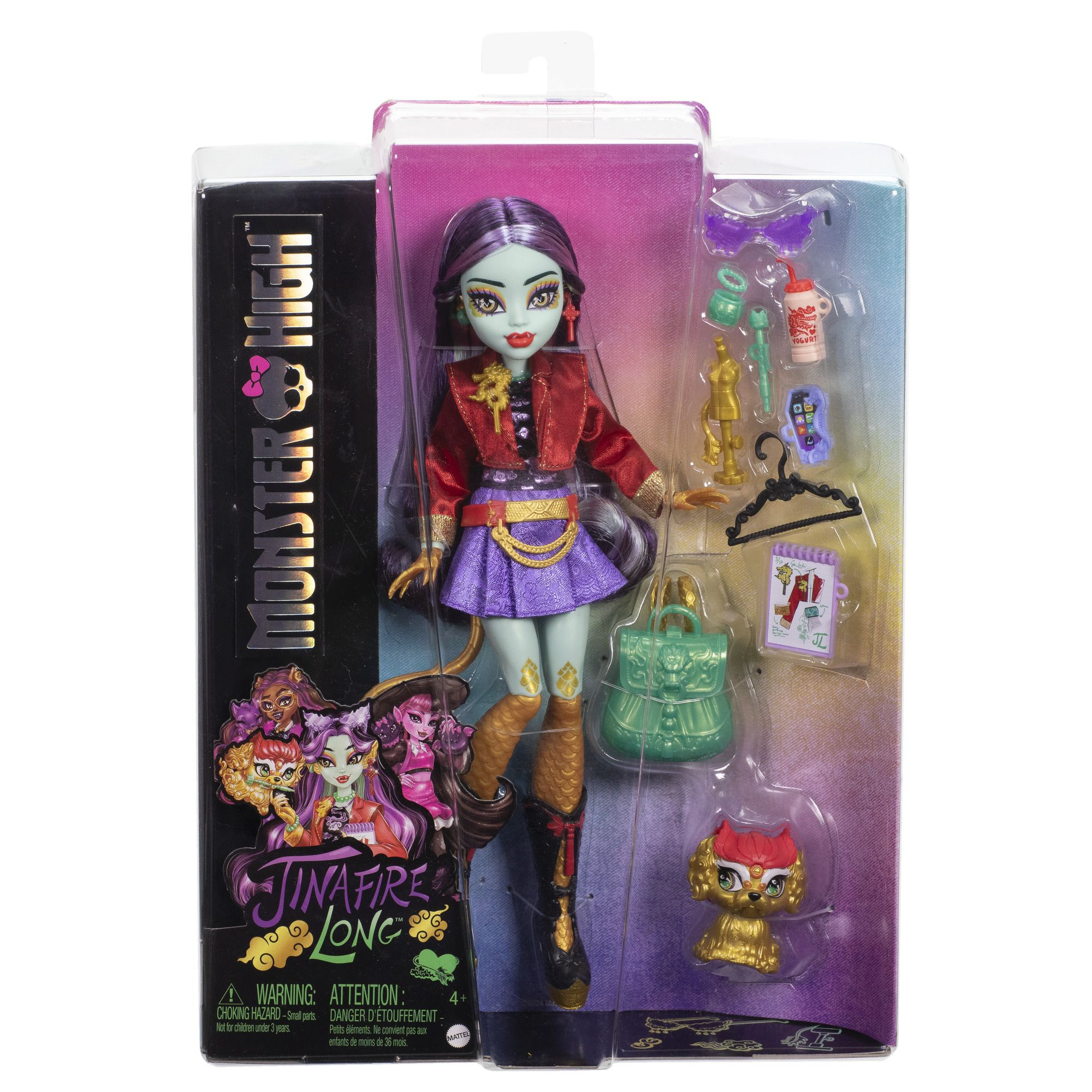 Seznamte se s Jinafire Long! Tato studentka přijela na výměnný pobyt z Fanghai a je to zasněná dračice, která miluje navrhování oblečení. Panenka Jinafire Long je doplněna o 7 strašidelně zábavných doplňků a o svého roztomile děsivého mazlíčka Cloudy „Yun Yun“ - křížence pekingského psíka a tradičního čínského lva. Děti od 4 let si ji oblíbí jako součást své sbírky Monster High panenek. Panenka nemůže stát samostatně. Barevné provedení se může lišit.