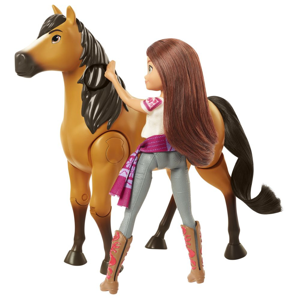 Staňte se součástí přátelství, statečnosti a dobrodružství v kresleném filmu Spirit společnosti DreamWorks! Herní set Kouzelná vyjížďka s panenkou Lucky a koněm Spirit je tímto filmem inspirována a přináší prvek nasednutí na koně, který panence Lucky (přibl. 18 cm) umožňuje jezdit na koni Spirit (přibl. 20 cm). Spirit je schopen realistické chůze díky pohybujícím se kloubům, takže Lucky na něm může jezdit! Panenka Lucky je krásně oblečená do zdobné tkané blůzky, tvarovaných jezdeckých kalhot, v pase má šerpu a na nohou ikonické boty své matky. Spirit je ozdoben krásným, dlouhým ocasem, s jehož žíněmi si lze hrát. Ve výbavě má také hřebílko a jablka jako malé občerstvení. Děti si hru na jezdeckou zábavu z filmu zamilují! Barvy a vzhled se mohou lišit. Panenka nemůže stát sama. Set představuje ideální dárek pro děti od 3 let.