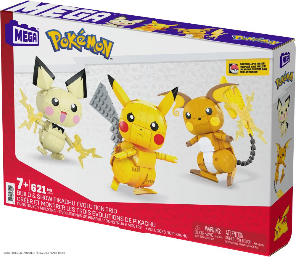 Stavebnice MEGA™ Construx Postav a vystav si Pikachu a jeho vývojové trio obsahuje kompletní evoluce Pichu, včetně Pikachu a Raichu, z nichž každý má kloubové končetiny a je vybaven vlastní speciální silou. Speciální dílky, které zapadají do Pichuových rukou, představují elektrickou sílu, zatímco Pikachu a Raichu jsou vybaveni vlastními mocnými pohyby.