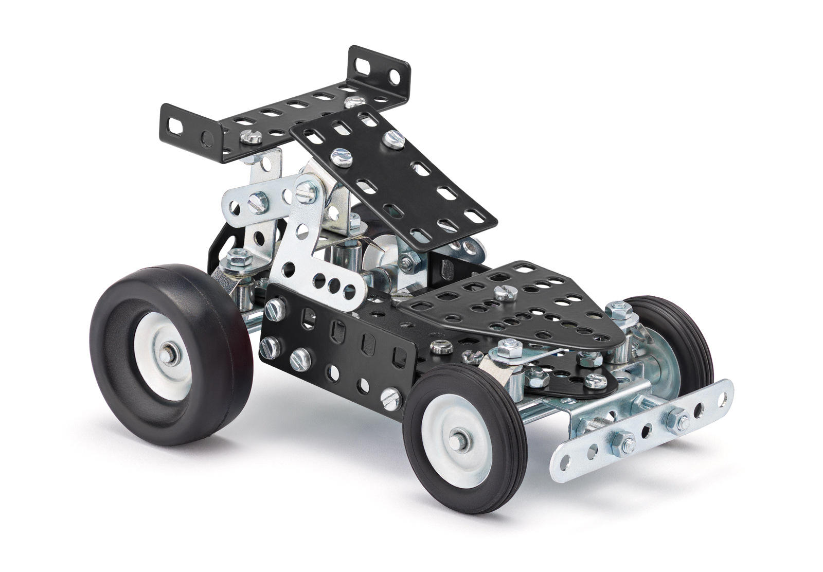 Jedná se o exkluzivní stavebnici, která je replikou podobných stavebnic ze začátku minulého století. Veškeré součástky jsou z tradičních materiálů a v barvách jako je zinek, patina či bezbarvý lak. Neobsahuje klasický návod, pouze knihu předloh. Tato jedinečná sada je ideálním nástrojem pro rozvoj technických dovedností a představivosti dětí. Stavebnice obsahuje kvalitní kovové díly, které se snadno spojují šroubky, což podporuje rozvoj jemné motoriky, logického myšlení a soustředění. Počet dílků: 929. Úroveň Merkur obtížnosti: 3. Barvy, velikost a vzhled výrobku se mohou lišit oproti uvedeným fotografiím. Baleno v krabičce. Rozměry balení: 29 x 38 x 5 cm. Nevhodné pro děti mladší 3 let. Věk: 6+