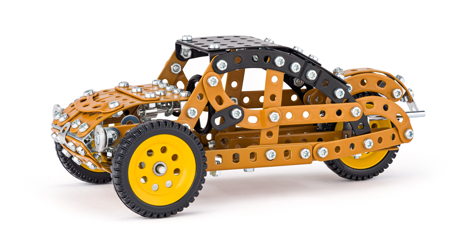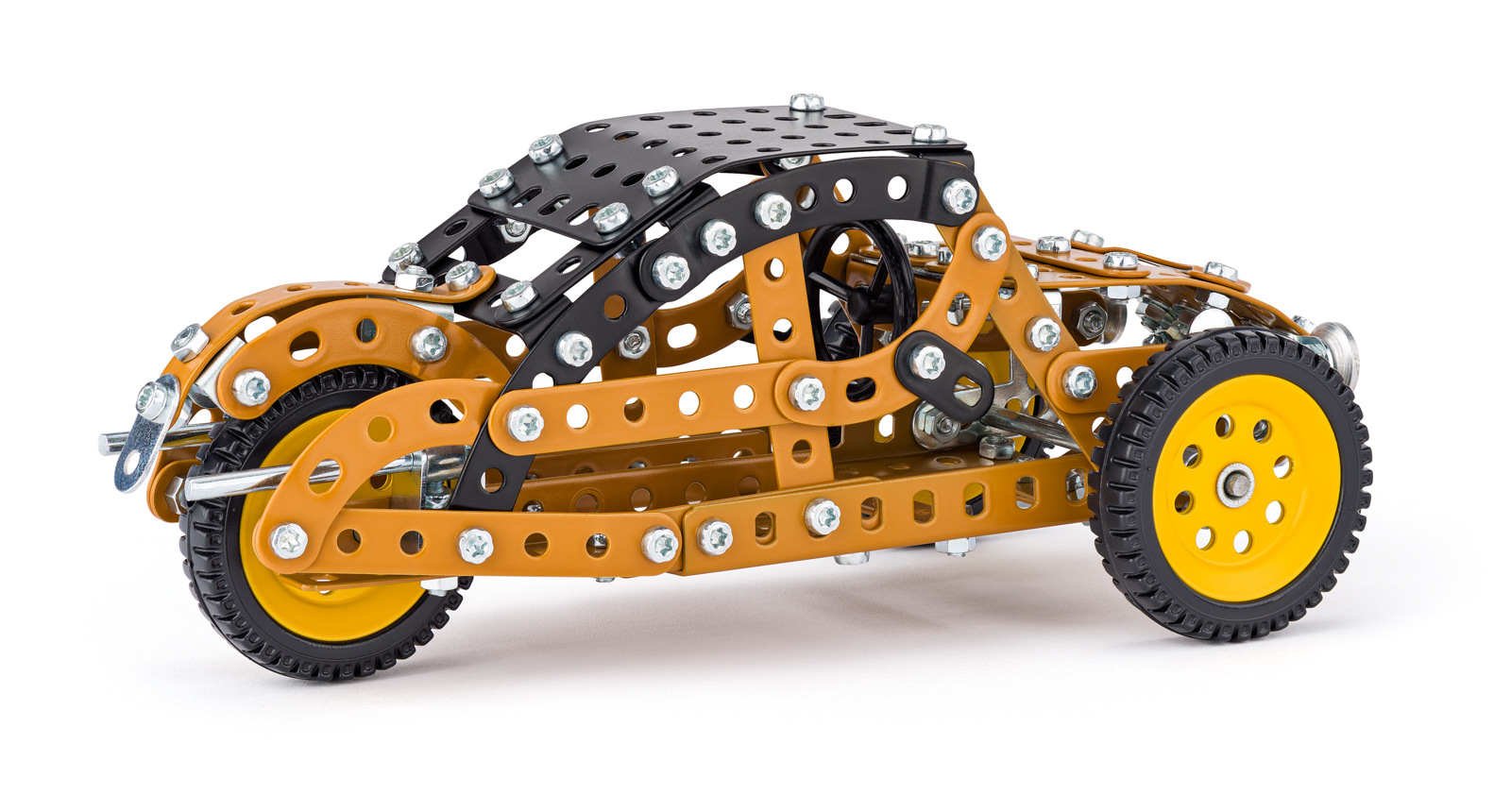 Jedná se o exkluzivní stavebnici, která je replikou podobných stavebnic ze začátku minulého století. Veškeré součástky jsou z tradičních materiálů a v barvách jako je zinek, patina či bezbarvý lak. Neobsahuje klasický návod, pouze knihu předloh. Tato jedinečná sada je ideálním nástrojem pro rozvoj technických dovedností a představivosti dětí. Stavebnice obsahuje kvalitní kovové díly, které se snadno spojují šroubky, což podporuje rozvoj jemné motoriky, logického myšlení a soustředění. Počet dílků: 929. Úroveň Merkur obtížnosti: 3. Barvy, velikost a vzhled výrobku se mohou lišit oproti uvedeným fotografiím. Baleno v krabičce. Rozměry balení: 29 x 38 x 5 cm. Nevhodné pro děti mladší 3 let. Věk: 6+