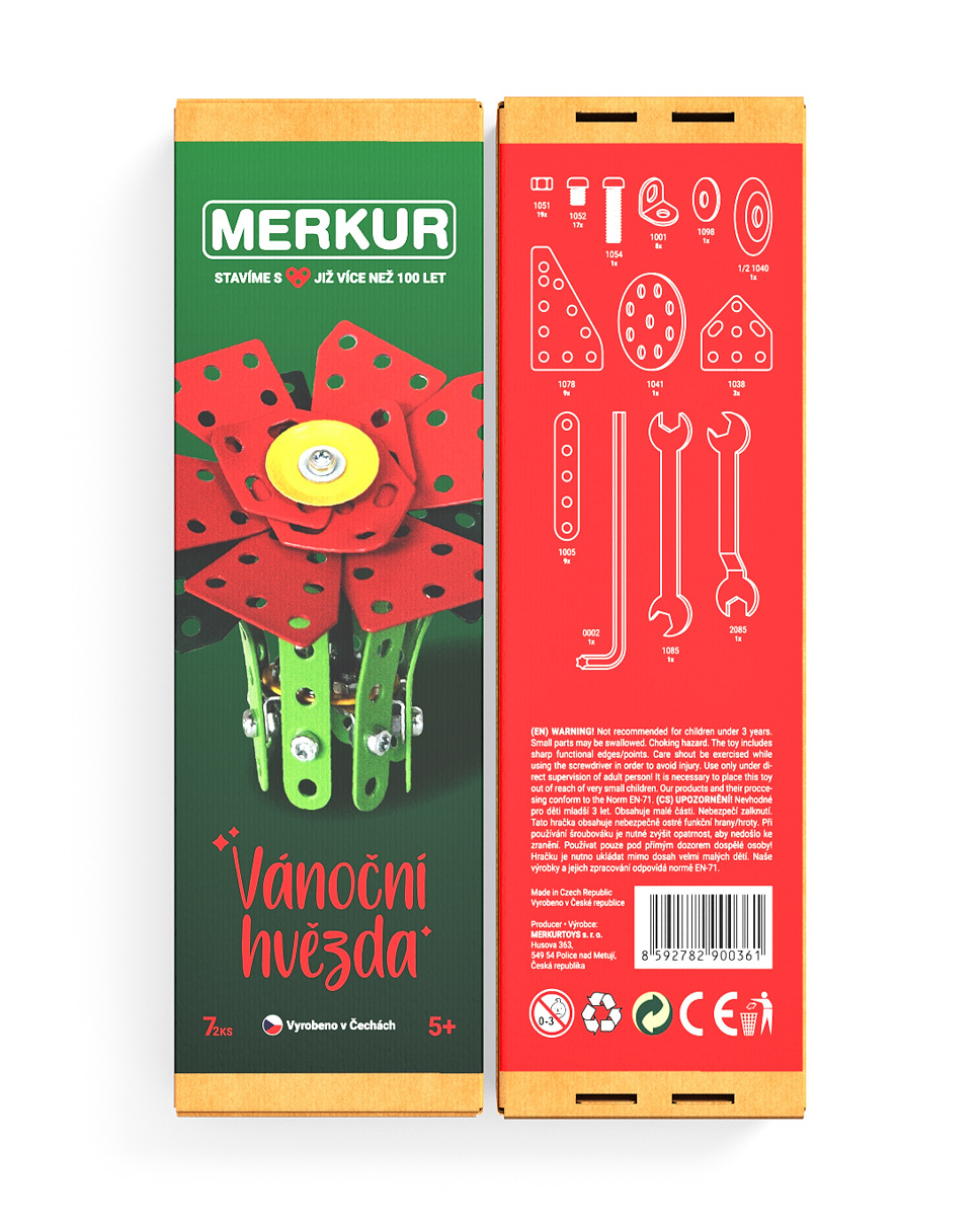 Kovová stavebnice Merkur Vánoční hvězda je malý sváteční projekt pro každého. Roztomilý model v barevném balení přináší radost i výzvu – střední obtížnost zaručí příjemné chvíle při sestavování. Stavebnice obsahuje kvalitní kovové díly, které se snadno spojují šroubky, což podporuje rozvoj jemné motoriky, logického myšlení a soustředění. Sada obsahuje: 72 dílků. Úroveň Merkur obtížnosti: 3. Baleno v krabičce. Rozměry modelu: 7 x 9 x 9 cm. Rozměry balení: 21,5 x 7 x 2,7 cm. Nevhodné pro děti do 3 let. Věk: 5+
