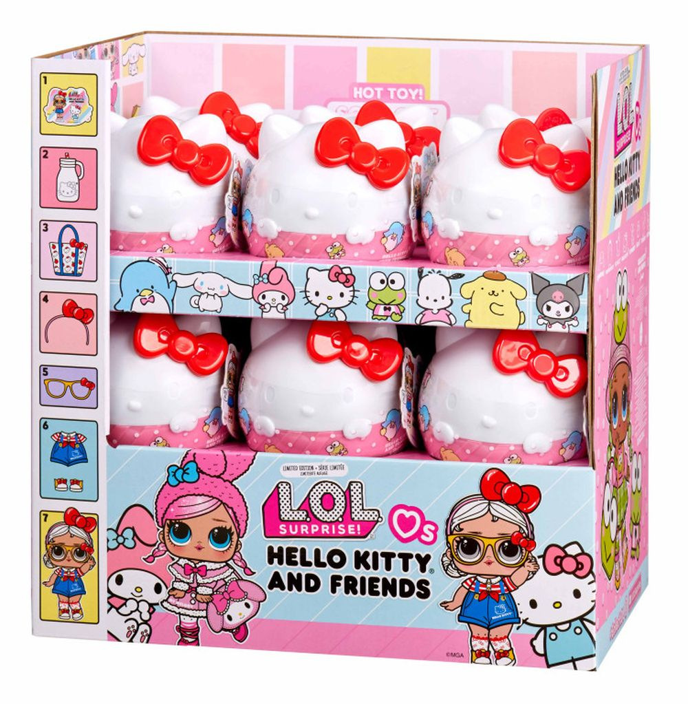 L.O.L.Surprise! se spojilo s ikonickou Hello Kitty. V obalu ve tvaru kočičky s červenou mašlí najdeš jednu panenku inspirovanou Hello Kitty nebo jejími přáteli, a to My Melody, Kuromi, Pompompurin, Cinnamoroll, Tuxedo Sam, Keroppi a Pochacco.