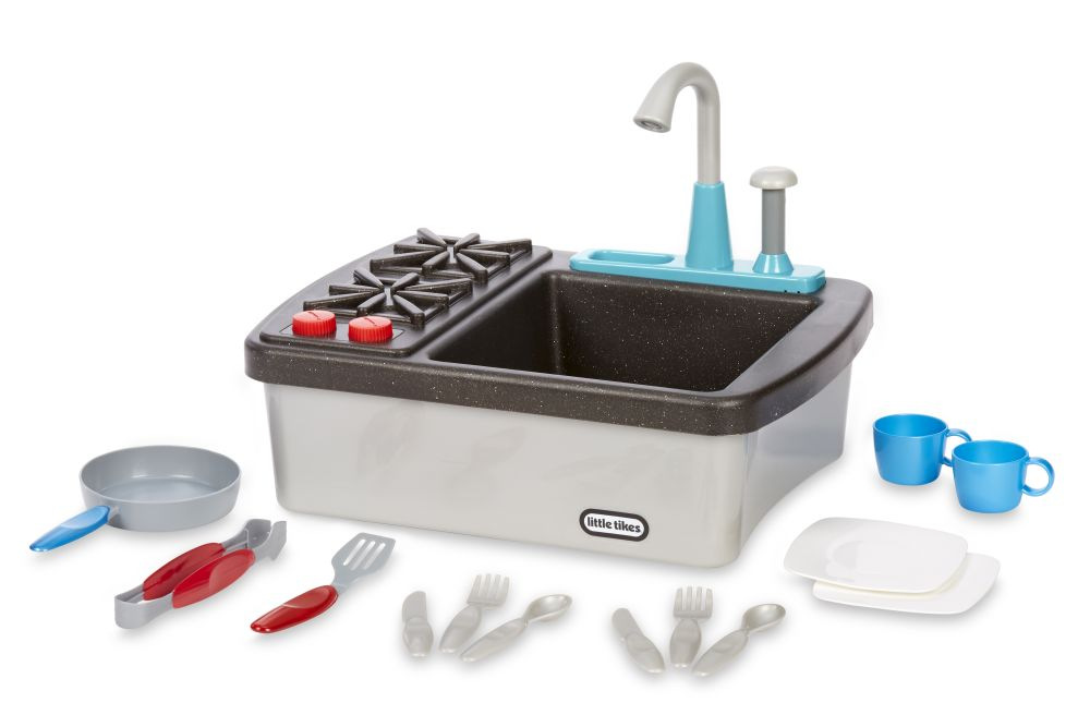 Little Tikes Můj první dřez je interaktivní hračka navržená tak, aby vypadala realisticky, takže děti mohou předstírat, že umývají nádobí stejně jako jejich rodiče.