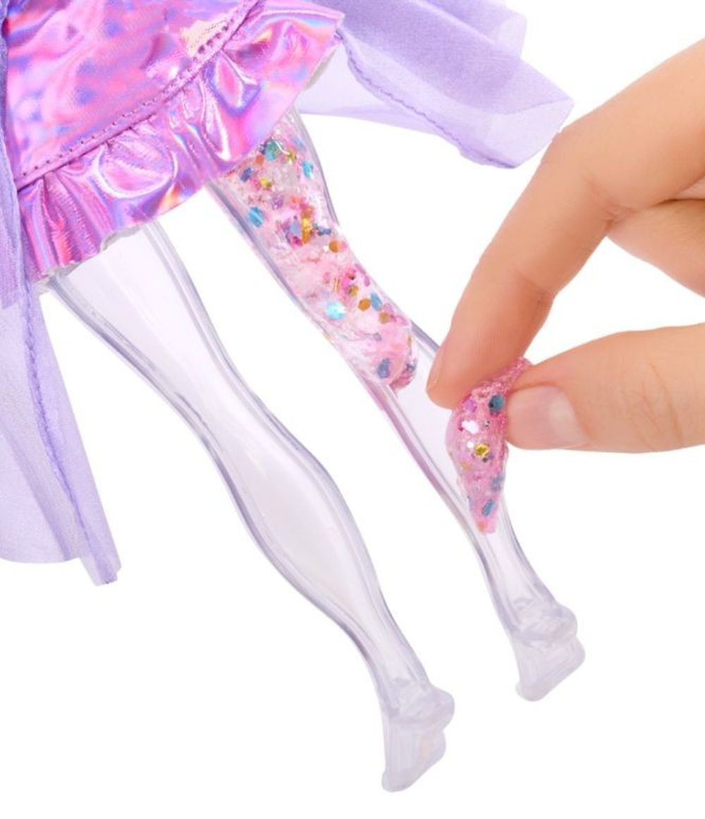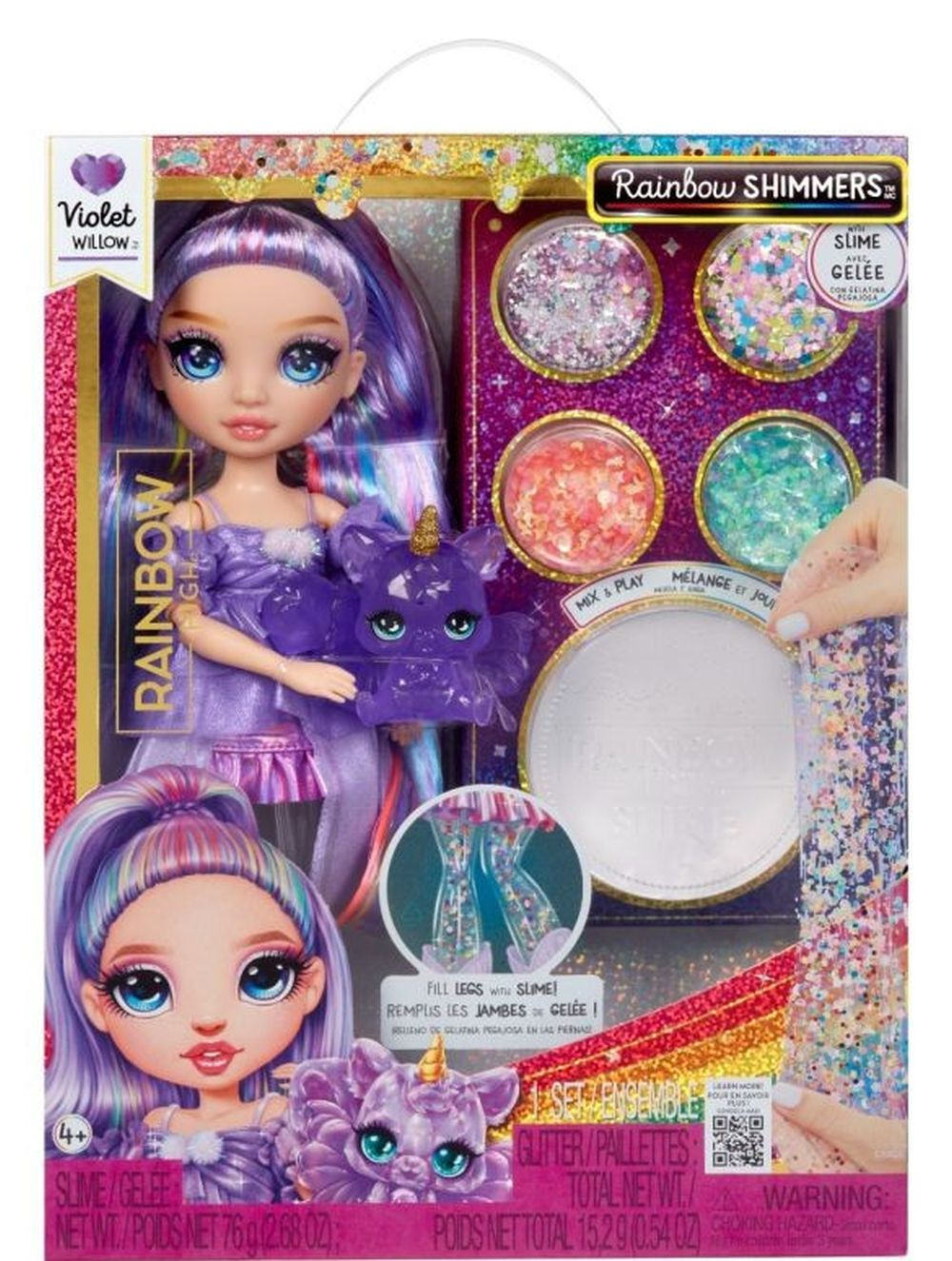 Rainbow High panenky jsou ještě kouzelnější! Společně se svými malými sestřičkami objevují nový svět, nové outfity a zcela nový způsob hraní. Každá panenka přichází s průhledným slizem a čtyřmi druhy třpytek. Třpytky přidej do slizu a uprav ho podle své fantazie. Poté sliz dej do průhledných nohou panenky a sleduj, jak se její nohy promění! Je to tak snadné! Sundej zadní část nohou, přidej sliz, zacvakni nohy zpět a můžeš si hned hrát! A to nejlepší? Můžeš to dělat znovu a znovu. Nebo můžeš třpytky a sliz kombinovat mezi různými panenkami.