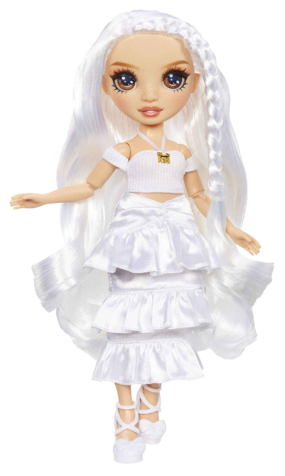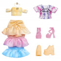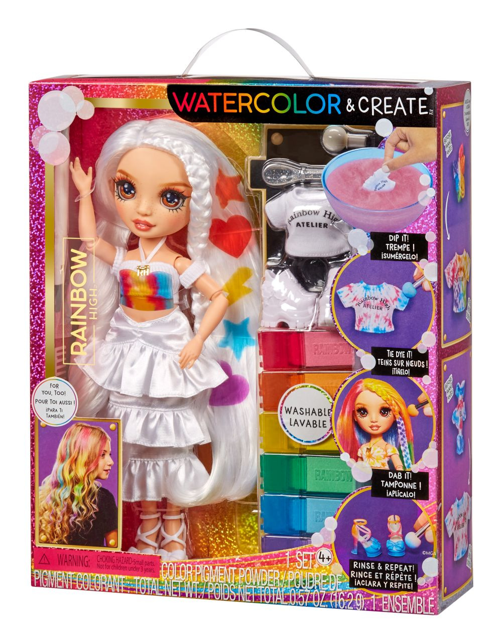Udělejte si svou vlastní Rainbow High panenku! V balení najdeš panenku s bílými vlasy oblečenou od hlavy k patě do bílé barvy a 6 smývatelných duhových prášků (červený, oranžový, žlutý, zelený, modrý a fialový), gumičky k batikování a aplikační houbičku. Existuje nekonečně mnoho způsobů, jak vybarvit oblečení panenky nebo její vlasy. Po dokončení můžeš panenku opláchnout a vybarvit ji úplně jinak. Prášek nasypeš do vody. Do barevné vody můžeš namočit vlasy a oblečení, nebo houbičku, kterou budeš vytvářet vzory. Pomocí gumiček svaž oblečení a vytvářej různě batikovaný outfit.