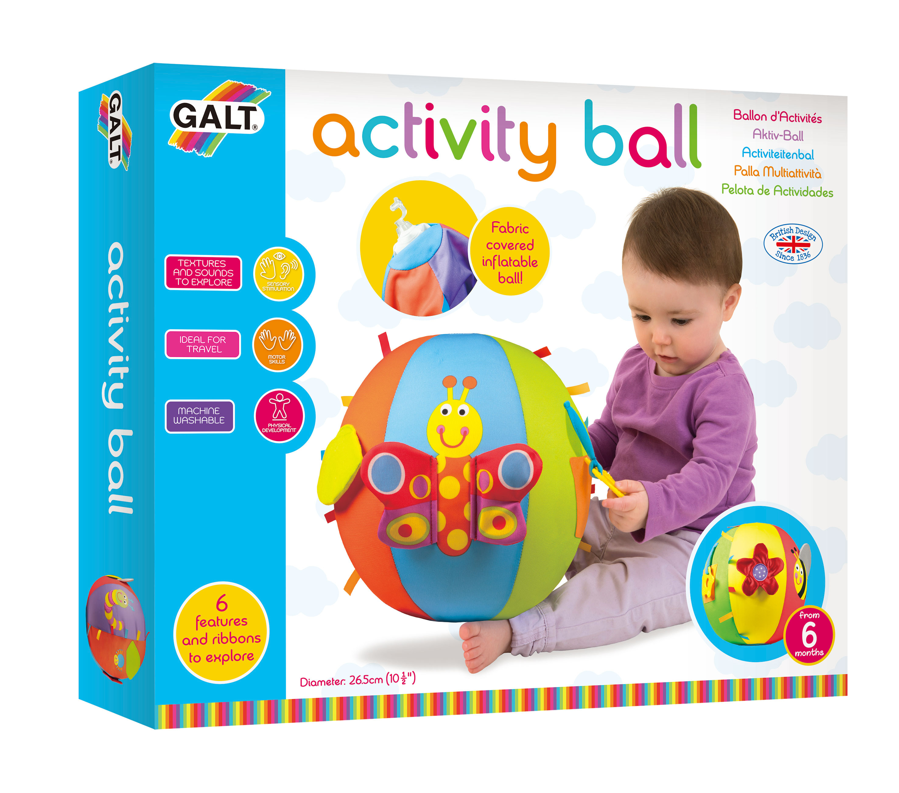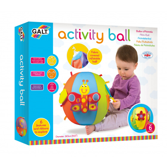 Na míči je připevněno 6 druhů aktivit pro děti a barevné pásy po stranách.