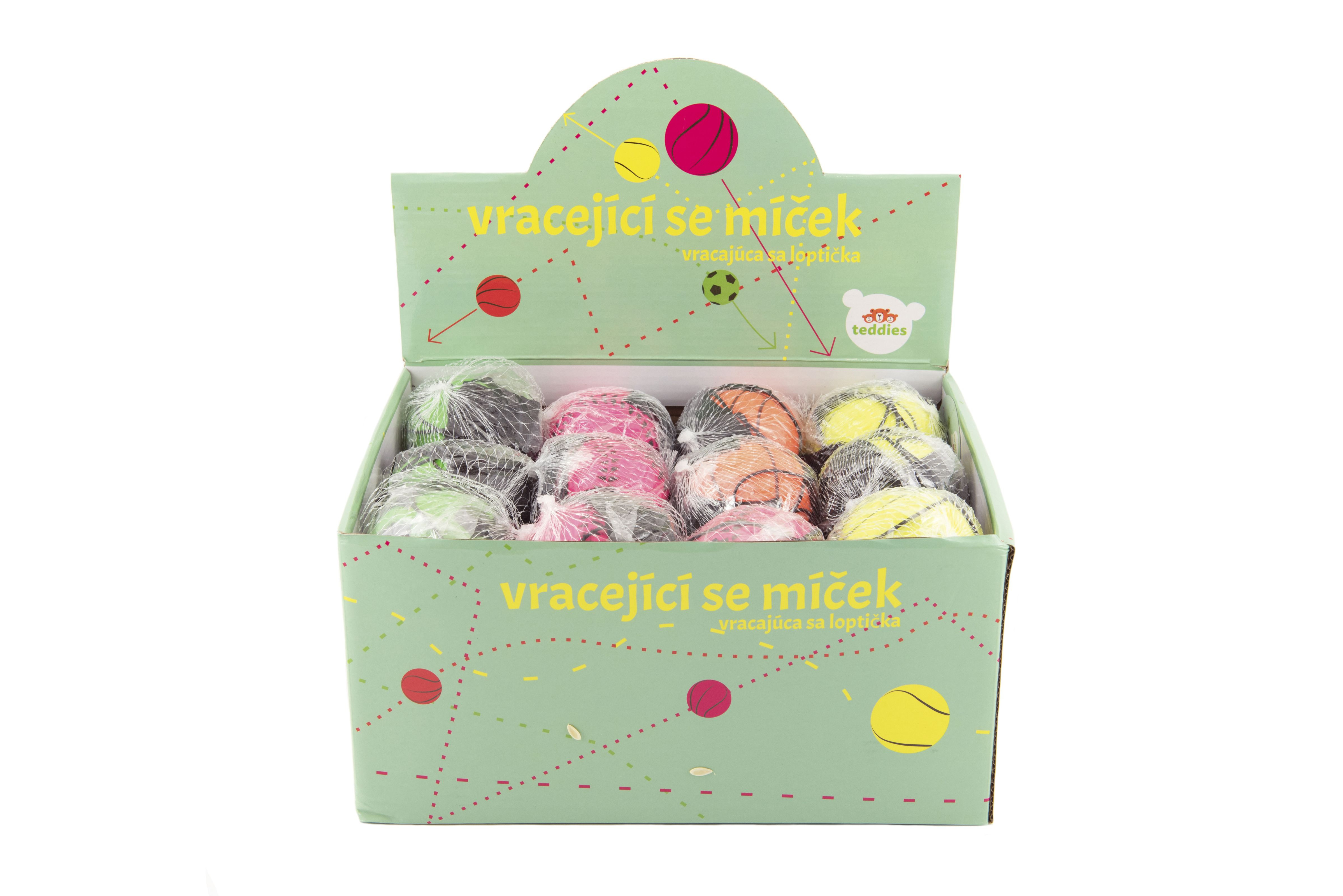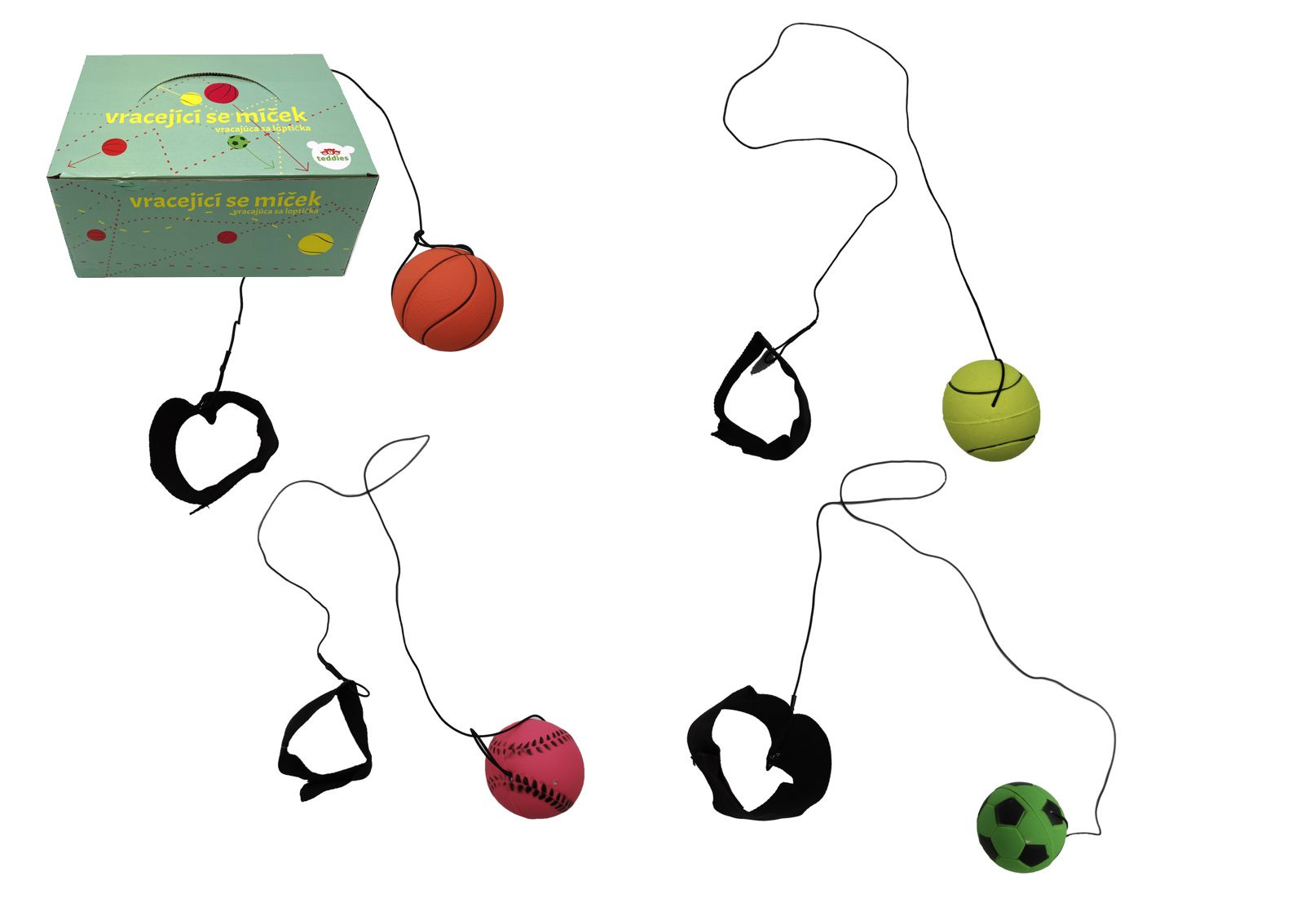 Vracející se míček je ideální hračkou pro zabavení. Míček je přivázaný na tkaničce, díky které vám míček nikdy neuletí. Můžete si s ním házet o zeď nebo o zem. Balonek ve čtyřech různých vzhledech podle druhu sportu, baleno v sáčku. Rozměry výrobku 6 x 6 x 6 cm. Vhodné pro děti od 3 let.