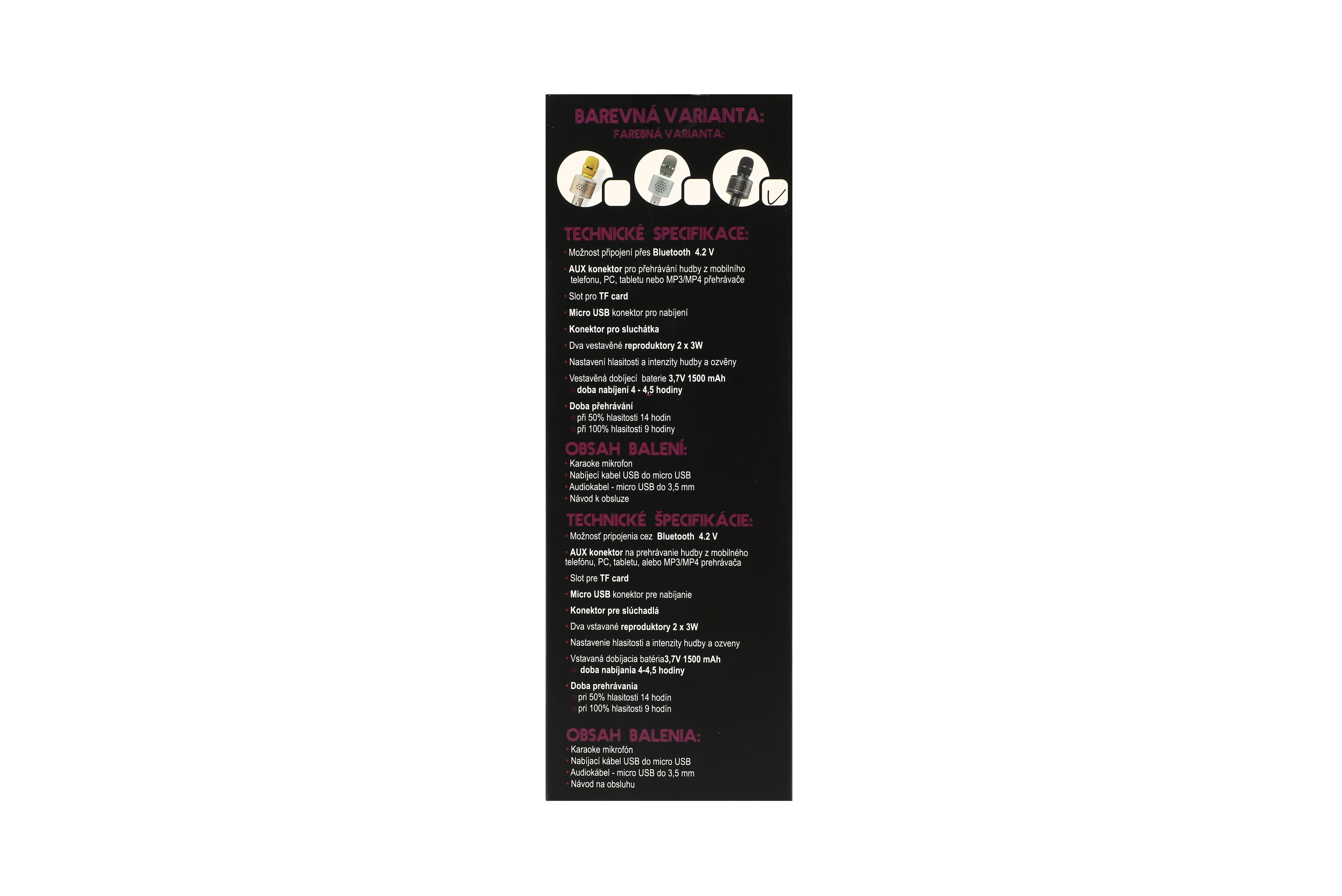 Bezdrátový karaoke mikrofon nesmí chybět na žádné párty. Pomocí kabelu nebo Bluetooth propojíte svůj telefon s mikrofonem. AUX konektor pro přehrávání hudby z mobilního telefonu, PC, tabletu nebo MP3/MP4 přehrávače. Obsahuje slot pro TF card - zapněte mikrofon delším stiskem tlačítka ON, vložte paměťovou kartu a mikrofon začne přehrávat hudbu uloženou na kartě. Můžete začít zpívat společeně s mikrofonem. AUX konektor - zapojte kabel s koncovkou do AUX slotu a druhou koncovku USB do mobilu, tabletu, PC nebo MP3. Mikrofon začne přehrávat hudbu, kterou si v připojeném zařízení vyberete a můžete začít zpívat. Při zapnutí mikrofonu Bluetooth pracuje spontánně. Pokud spojení nenaváže, hledá jiné Bt spojení. Pokud mikrofon nemůžete spárovat, zkontrolujte, zda zařízení, se kterým chcete mikrofon spárovat podporuje A2DP. Možné nastavení hlasitosti a intenzity hudby a ozvěny. Technické údaje: - bluetooth 4.2V, vzdálenost větší než 1m - reproduktory 2x 3W - frekvence 90 Hz - 10 KHz - baterie dobíjecí 3,7V 1500mAh lithium baterie (nevyměnitelná) - doba nabíjení 4,5 hod (vypnutý) - doba provozu při 50% hlasitosti je 14 hodin, při 100% hlasitosti je 9 hodin. Obsah balení: karaoke mikrofon, nabíjecí kabel USB do Micro USB, audiokabel, návod k obsluze. Barva: černá. Přejeme skvělou zábavu! Rozměry balení 10 x 28 x 9 cm. Není hračka.