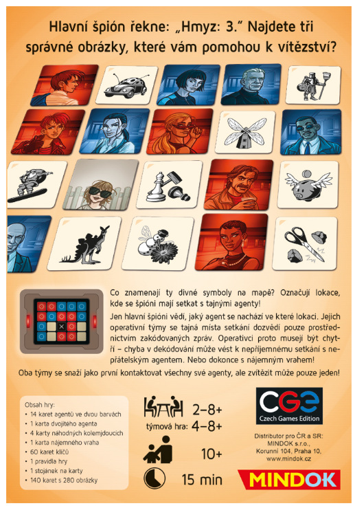 Hlavní špión řekne: „Hmyz: 3.” Najdete tři správné obrázky, které vám pomohou k vítězství? Co znamenají ty divné symboly na mapě? Označují lokace, kde se špióni mají setkat s tajnými agenty? Jen hlavní špióni vědí, jaký agent se nachází ve které lokaci. Jejich operativní týmy se tajná místa setkání dozvědí pouze prostřednictvím zakódovaných zpráv. Operativci proto musejí být chytří – chyba v dekódování může vést k nepříjemnému setkání s nepřátelským agentem. Nebo dokonce s nájemným vrahem! Oba týmy se snaží jako první kontaktovat všechny své agenty, ale zvítězit může pouze jeden!Více