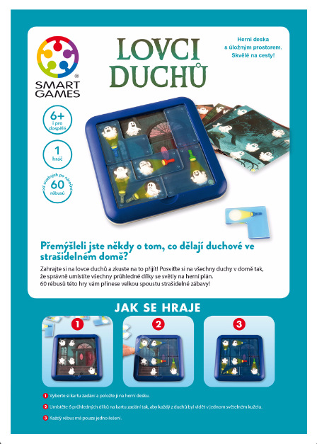 Přemýšleli jste někdy o tom, co dělají duchové ve strašidelném domě? Zahrajte si na lovce duchů a zkuste na to přijít! Posviťte si na všechny duchy v domě tak, že správně umístíte všechny průhledné dílky se světly na herní plán. 60 rébusů této hry vám přinese velkou spoustu strašidelné zábavy!