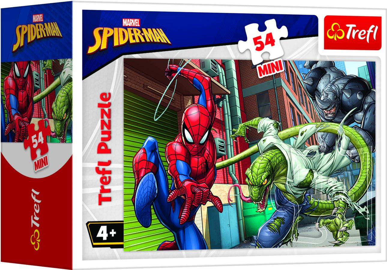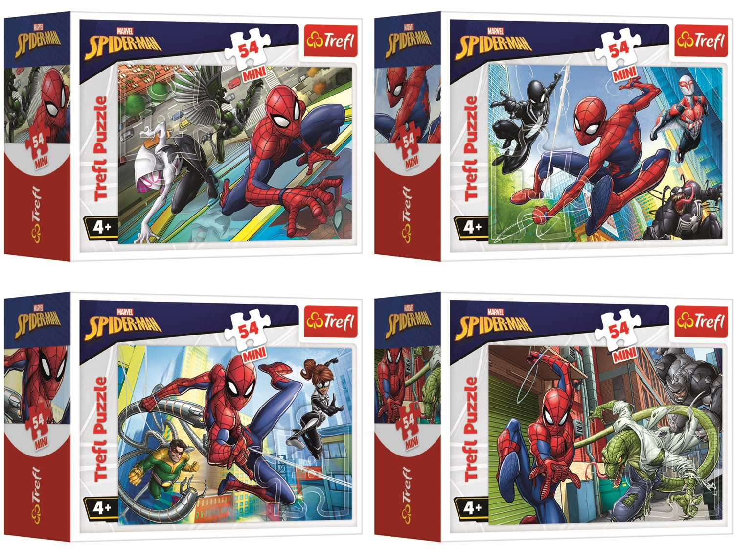 Popis Trefl Minipuzzle 54 dílků Spidermanův čas 4 druhy v krabičce 9x6,5x4cm