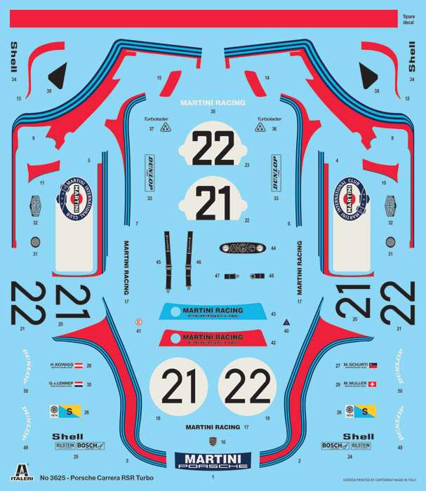 Informace o originálu: Porsche 911 Turbo Carrera RSR bylo postaveno v roce 1974 ve čtyřech exemplářích pro účast v sezóně závodů mistrovství světa konstruktérů. Bylo tak možné sledovat v akci tovární tým s jedním a někdy i dvěma vozy v barvách Martini Racing, svěřenými do rukou oficiálním posádkám Muller - van Lennep a Koinigg - Schurti. Přestože měly vozy Porsche téměř stejný výkon (kolem 500 koní) jako konkurenční stroje z kategorie Prototypů, nedosahovaly jejich lehkosti a ovladatelnosti. Šťastná kombinace rychlosti a spolehlivosti však Porschatům umožnila dosáhnout slušných výsledků v devíti závodech sezóny, včetně dvou druhých míst: jednoho ve 24 hodinách Le Mans a jednoho v 6 hodinách Watkins Glen.