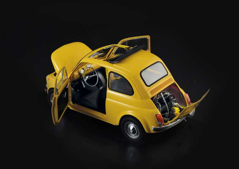 Informace o originálu: Fiat vyráběl model "Nuova 500" v letech 1957 až 1975. Je skutečnou ikonou na čtyřech kolech a jedním ze symbolů "made in Italy". Jeho jedinečný a rozpoznatelný design je známý po celém světě. Když italská automobilka tento malý vůz zakládala, měla jednoduchý cíl: uvést na trh za velmi přijatelnou cenu nový kompaktní vůz schopný rozšířit počet potenciálních zákazníků. Kromě toho měl být nový vůz snadno ovladatelný, a to i v městském provozu, a poskytovat velmi nízké provozní náklady. Fiat 500 byl uveden na trh v červenci 1957 a okamžitě zaznamenal úspěch. V roce 1965 byla představena verze 500F, která měla největší počet vyrobených kusů. Fiat 500F byl snadno rozpoznatelný díky předním otevíracím dveřím, v souladu s novými zákony přijal několik technicky i esteticky vylepšených řešení jako nový rám a širší čelní sklo. Fiat 500F je dodnes "nejklasičtější" verzí z celé produkce modelu 500 a zůstává v srdci obrovského množství automobilových fanoušků.