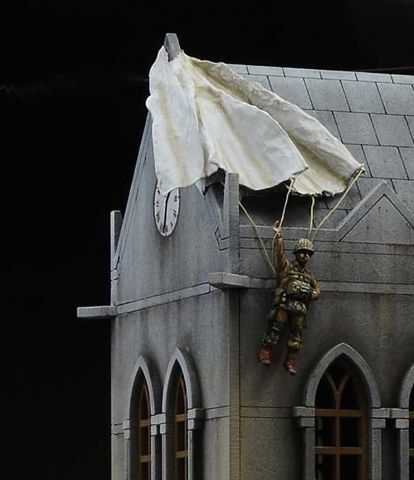 Informace o originálu: V rámci celkového strategického plánování proslulé operace "Overlord", což byl krycí název pro vylodění spojenců na plážích v Normandii, hrála klíčovou roli francouzská vesnice Sainte-Mère-Église. Na bitevních mapách byla správně označena jako důležitá silniční křižovatka, kterou mohli bránící se Němci využít k rychlým protiútokům na pláže Utah a Omaha. Bylo proto strategicky důležité, aby na vesnici rychle zaútočily americké výsadkové jednotky, rychle ji obsadily a zajistily tak důležitou podporu vylodění. 6. června 1944 v časných ranních hodinách výsadkáři slavné 82. a 101. americké výsadkové divize po krátkém intenzivním boji malé francouzské město úspěšně zajistili. Jejich přínos byl široce uznán a oslavován v mnoha filmech od "Nejdelšího dne" natočeného v 60. letech 20. století až po nejnovější válečné filmy.