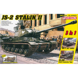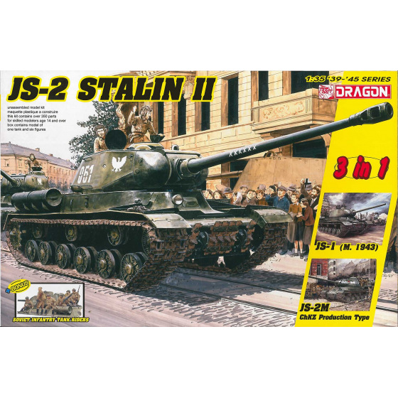 Informace o modelu: Dragon představuje prvotřídní model v měřítku 1/35 představující těžké ruské tanky JS. A hlavním lákadlem je, že se jedná o stavebnici 3 v 1. Modeláři si tak mohou vybrat, zda postaví typ JS-1, JS-2 nebo JS-2m ChkZ. V balení samozřejmě nechybí žádné nezbytné díly pro všechny varianty. Kromě přehlídky všestrannosti ruské těžké obrněné techniky potom dostanete i sadu figurek z nabídky Dragon v měřítku 1/35 představujících příslušníky sovětské pěchoty vezoucí se na tanku.