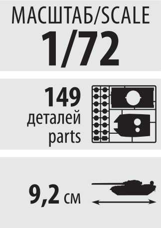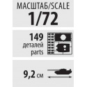 Model tanku ke slepení. Velikost: 1:72; 9,2 cm. Balení obsahuje: 149 dílků ke slepení.