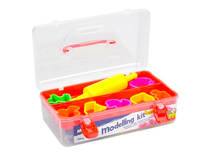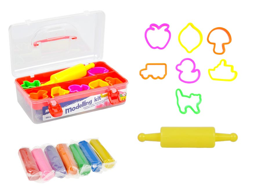 Kreativní modelovací sada (550 g), která rozvíjí zručnost a kreativitu dítěte.Sada obsahuje:- 7 barev modelovací hmoty (růžová, oranžová, žlutá, červená, zelená, modrá, fialová)- 7 barevných tvořítek různých tvarů- 1 váleček Varování:Nevhodné pro děti do 3 let. Nebezpečí vdechnutí a spolknutí malých částic.Dodáváme v plastovém kufříčku s uchem.Uvedená cena je za 1 sadu.