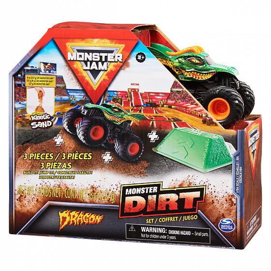 Sada Monster Jam Monster Dirt Dragon Set. Od tvůrců Kinetic Sand přichází realistický Monster Dirt, který napodobuje skutečné podmínky Monster Jamu. Tato startovací sada s pískem přináší novou úroveň zábavy a zcela nový způsob, jak si hrát se všemi oblíbenými Monster Jam trucky. Formuj, stavěj a skákej po realistických prašných rampách s Monster Mutt Dalmatian v měřítku 1:64, který je odlitkem Monster Jam monster trucku. Tento model Monster Jam s autentickými detaily a grafikou, pneumatikami BKT nesmí chybět ve tvé sbírce monster trucků. Použij přiloženou formu startovací rampy přímo z krabice nebo ji použij k vymodelování a sestavení vlastní Monster Dirt rampy pro rychlou, vysoko letící akci. Když si zrovna nehraješ, slouží startovací rampa jako úložný kontejner. Hračky Monster Jam monster truck jsou ideálním dárkem pro děti od 3 let. Rozjeď svou vlastní akci Monster Jam se sadou Monster Dirt. Jazykové mutace: CZ, SK, EN, ESP, DE, PL, IT. Rozměr autíčka: 7,6 x 9,7 x 6,6 cm. Rozměry b