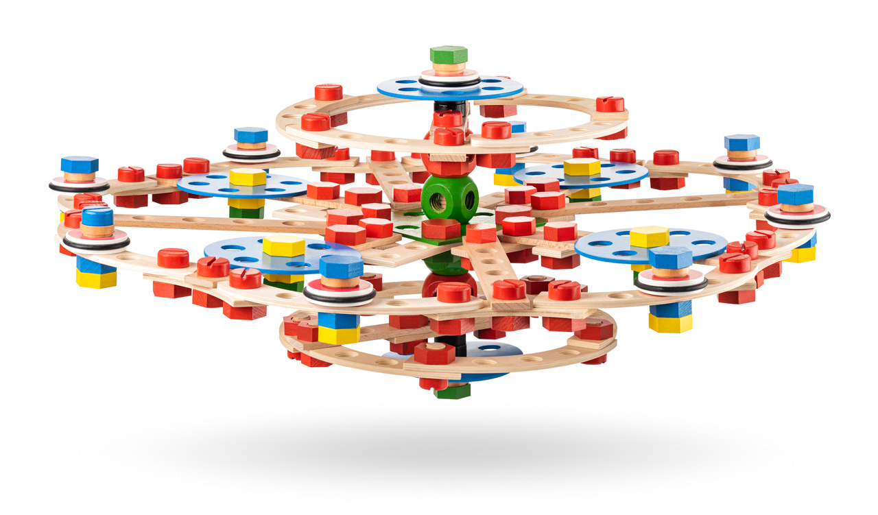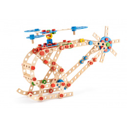 Montážní stavebnice "Engeneer" nabízí dětem konstrukční hru s nekonečným množstvím variant různých staveb od strojů a dopravních prostředků přes domečky , jeřáby až po létající talíře, mosty, věže atd. Obsahuje obrovské množství vysoce kvalitních dřevěných dílů ( dřevěné destičky v různých tvarech, matice, šrouby, kolečka, podložky, šroubovák a montážní klíč, atd...), se kterými se snadno pracuje a které po zatažení šroubů vytvoří pevnou konstrukci. Věk: 3+. Velikost dílku se 6ti dírkami: 22 cm, velikost obdélníkové destičky: 18,5 x 11 cm. Počet ks: 340